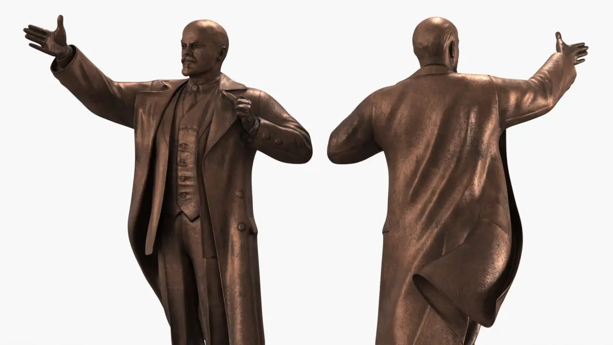 Vladimir Lenin Bronze Statue is a 3d model of a historical monument, depicting a standing figure with one arm raised in a gesture of leadership.