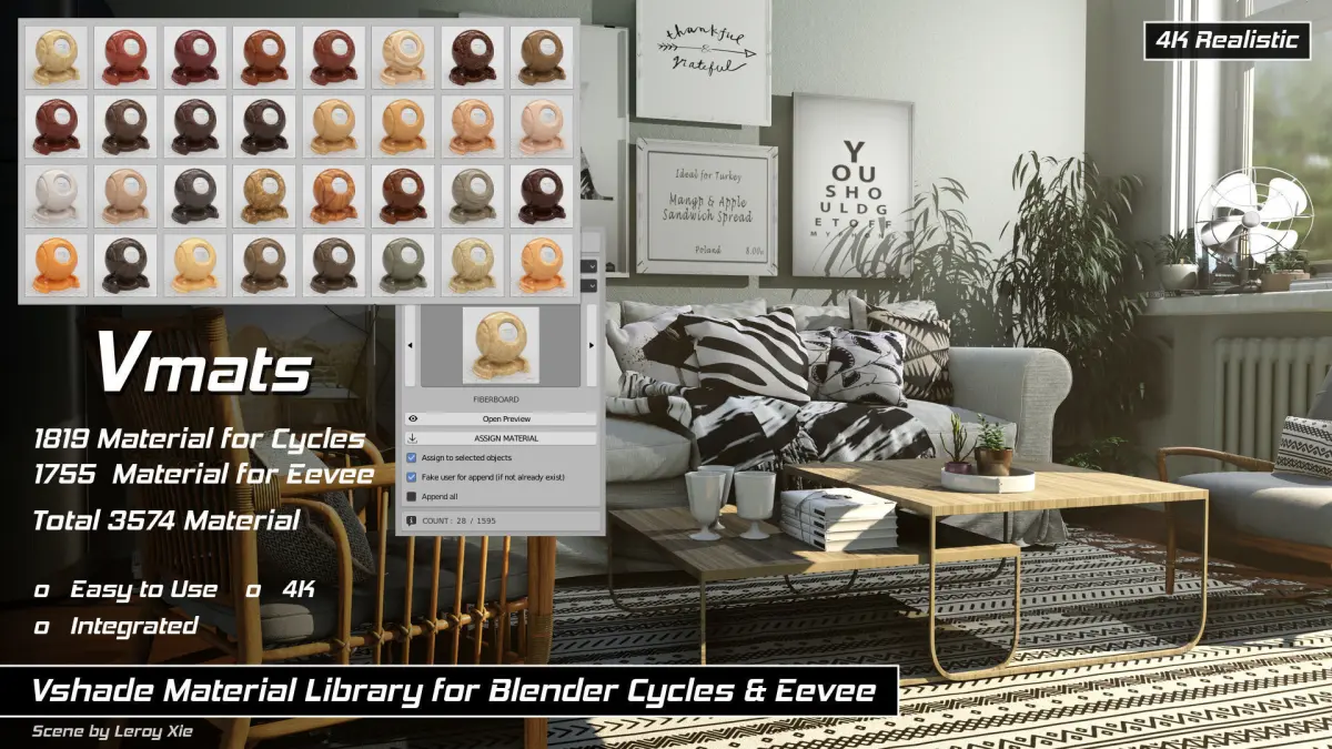 Vmats for Cycles contains 1819 materials, Vmats for Eevee contains 1755 materials. Vmats totally contains 3574 materials.