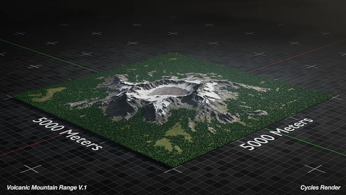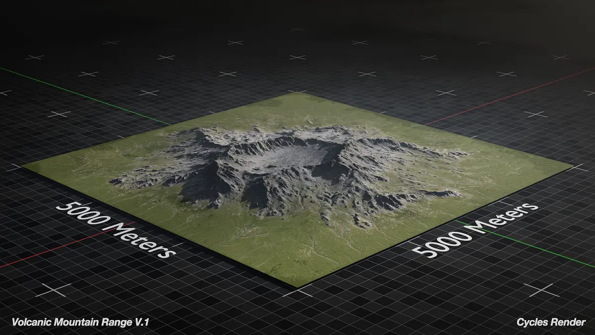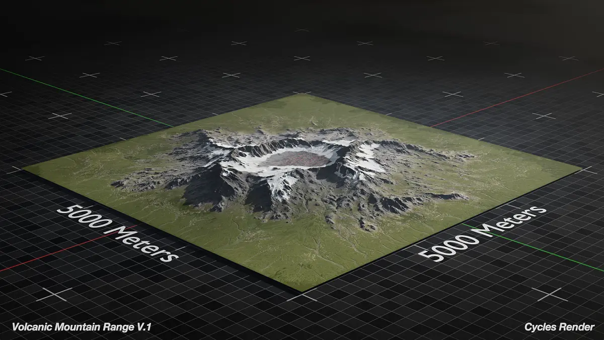 Optimized 3D Model of Large Volcano Mountain Range ready for Cinematics, Animations, and Games. This asset is native to Blender and Unreal Engine 5. This asset is based on a 5000x5000 km area but can be scaled to fit your needs and is meant for medium to far shots.