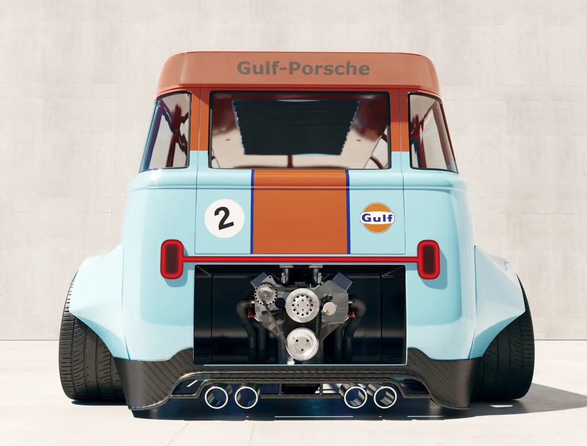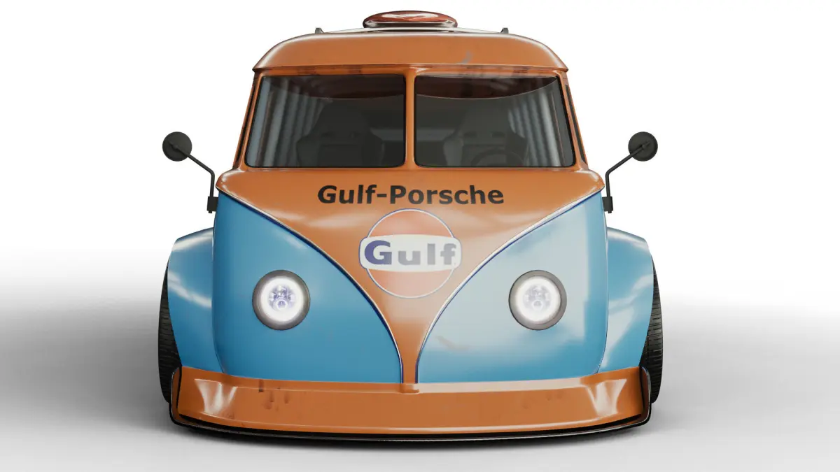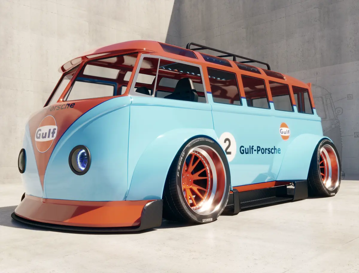 volkswagen 21 windows with porsche gulf stickers modeled in 3d max and I have used substance painter, vray rendering engine two million seven hundred thousand polygons and three million sixty-two thousand vertices
