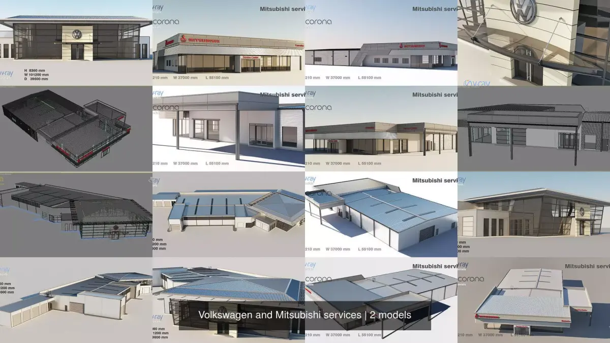 Mitsubishi service building - model ready for rendering. Maded in 3ds Max 2014 and rendered in vray & corona renderers. Industrial style. Just paste in your project , very helpful for backgrounds or middle range - no need adjusting, cause not used textures only materials-easy to use!