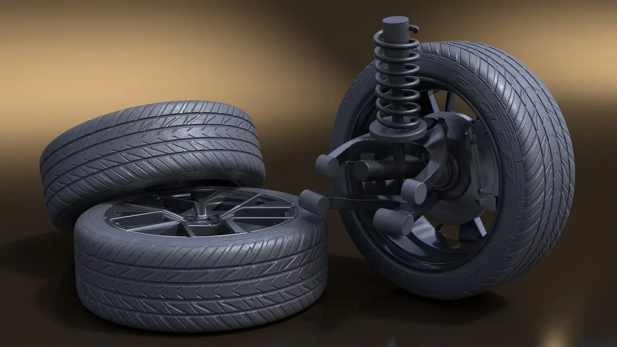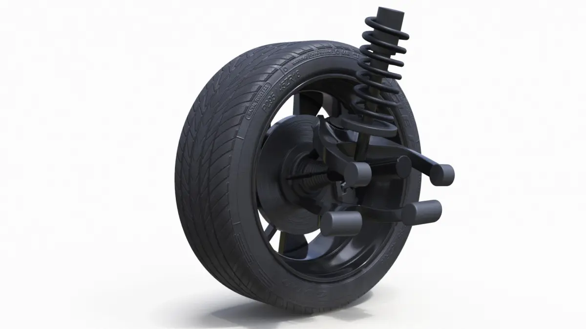 Volkswagen Car Wheel with Suspension is a three-dimensional model of Volkswagen car wheel assembly that is a part of a compact crossover SUV.