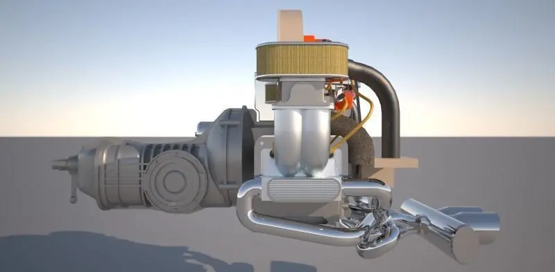 To favor the interior volume of the car, the engine is located behind the rear axle. However, in order not to compromise stability, the gearbox, differential and the engine itself formed a transaxle built entirely in light alloy and very compact, favored by the arrangement of the opposing four-cylinder boxer engine, which made it low and short. thus reducing the polar moment of inertia. Thanks to this rear boxer-longitudinal arrangement of the engine, a behavior similar to that of the rear engines positioned ahead of the axle was achieved without compromising the volume of the rear seat.In the 65 years that its production lasted, the Sedan had several different engines. These were: 800 cc; 900 cc; 1100 cc; 1200 cc; 1300 cc; 1302 cc; 1303 cc; 1500 cc; 1600 cc Carburetor and Platinum Ignition; 1600 cc Carburetor and Electronic Ignition; 1600 cc with Carburetor and Electronic Ignition and with the revolutionary Catalytic Converter; 1600 cc Electronic Injection with Generator and Catalytic Converter; and finally, 1600 cc of Electronic Injection with Alternator and Catalytic Converter.(https://es.wikipedia.org/wiki/Volkswagen_Tipo_1)