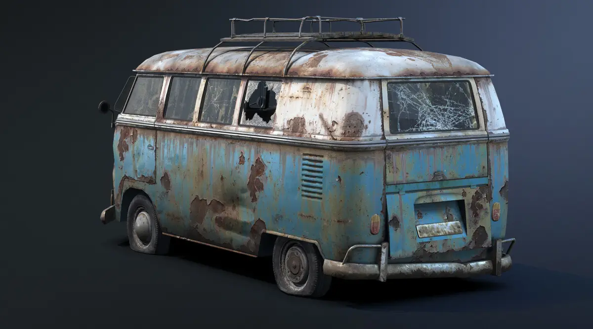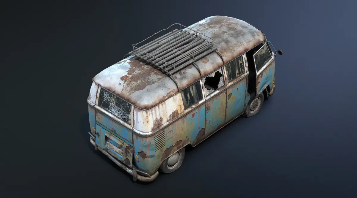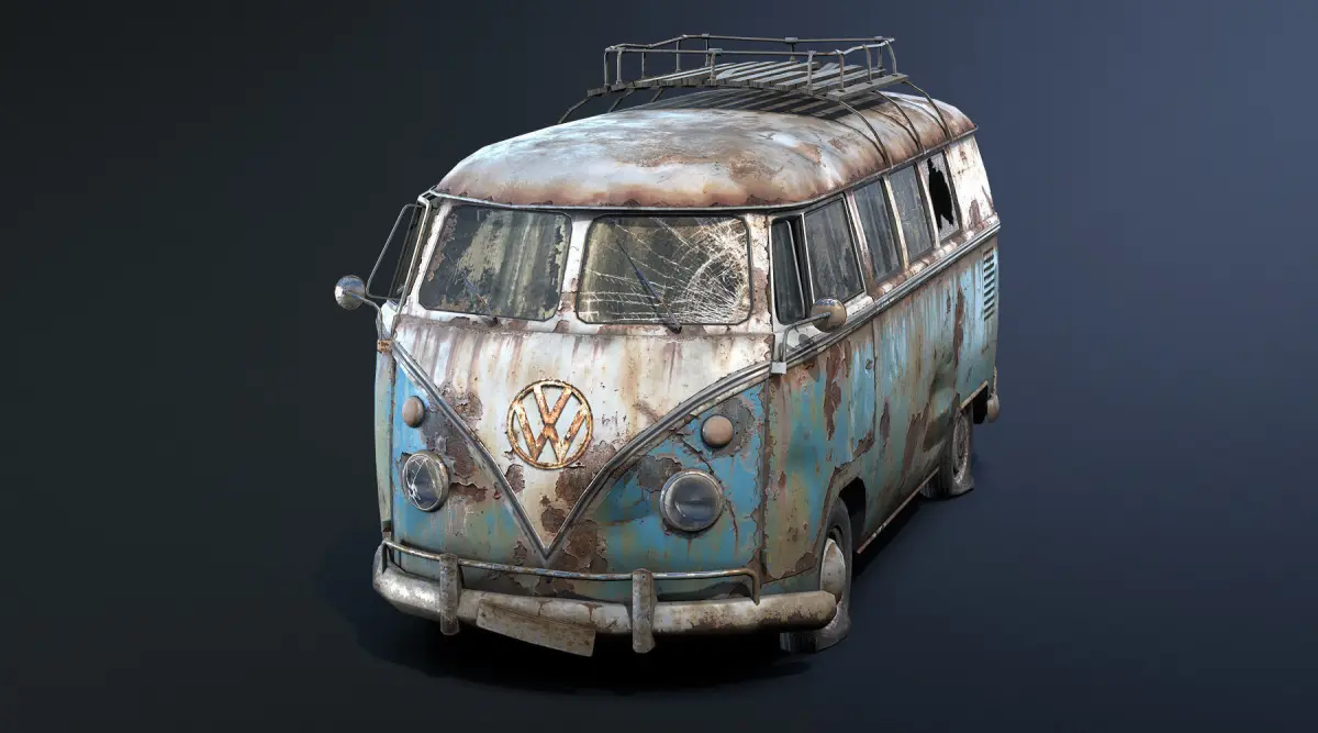 Game low-poly 3d-model of rusty abandoned retro bus Volkswagen T1 (Type 2).