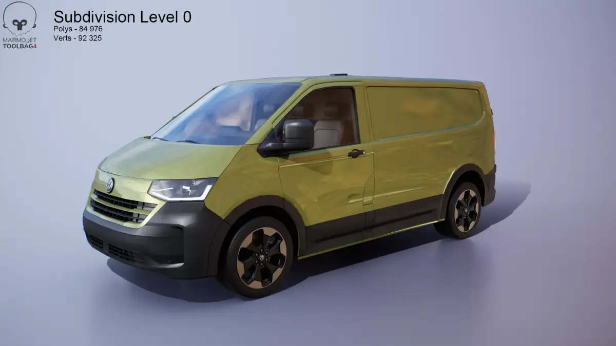 Highly detailed 3D model of the Volkswagen Transporter T7 PanAmericana. This model has been engineered for versatility, offering a high-fidelity 'Hero' mesh for close-up renders and optimized Levels of Detail (LODs) for real-time applications, simulations, and background population in architectural projects.