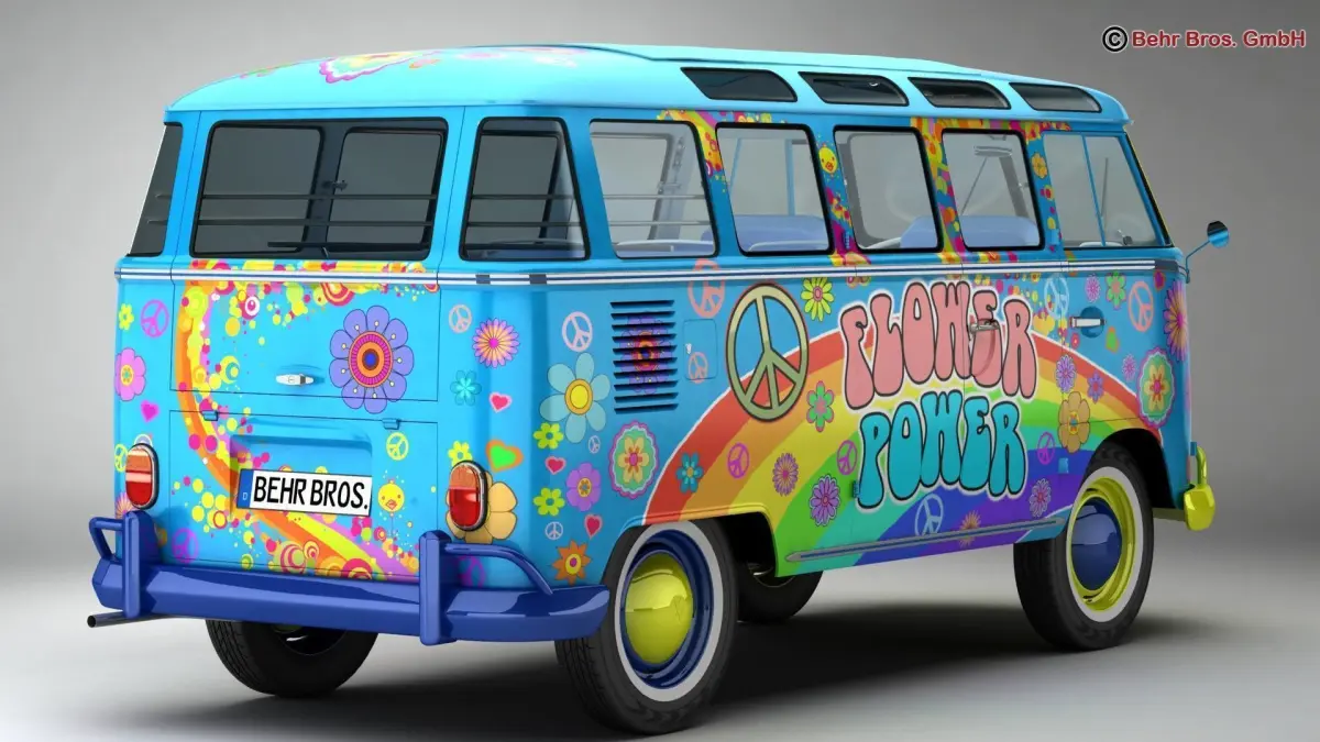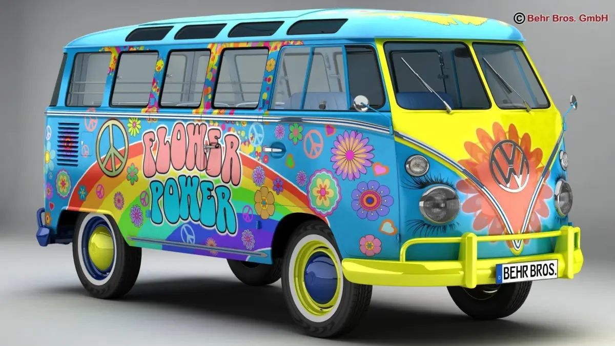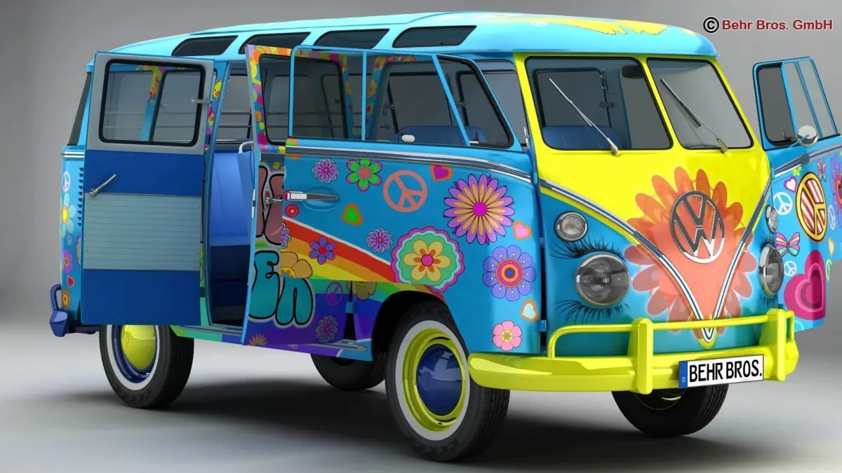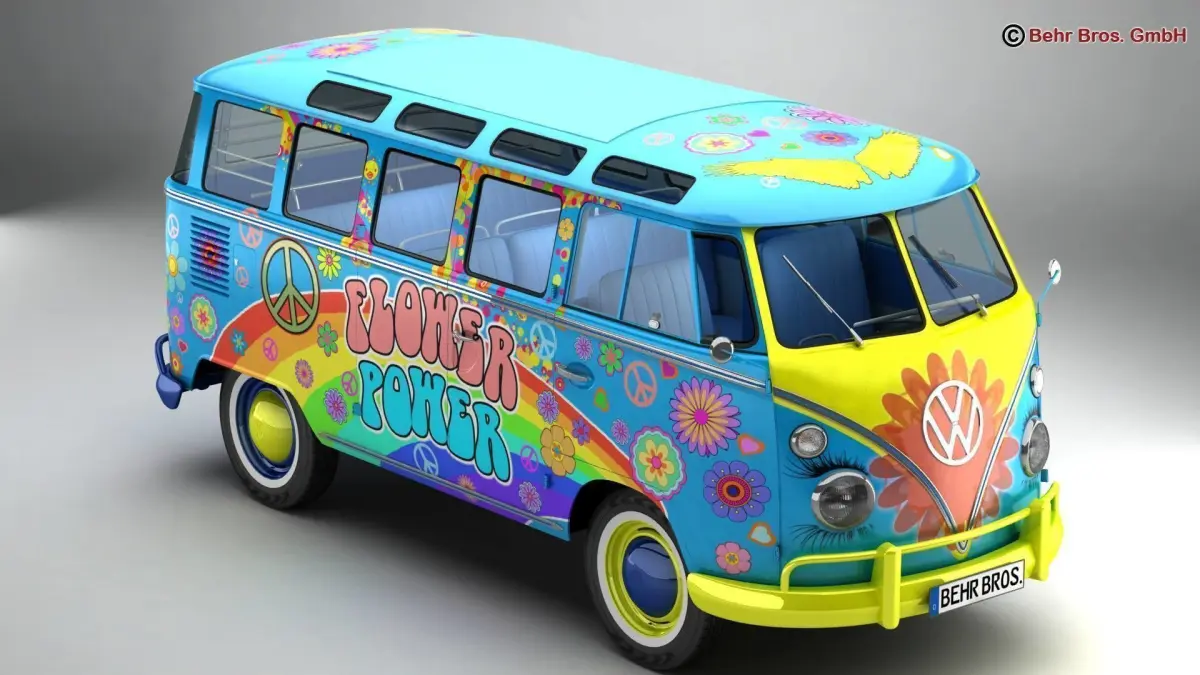 Accurate very high definition Volkswagen Type 2 Samba 1963 Hippie model with highly detailed interior fully textured. Headlights and taillights are modelled, doors can be opened. An opened and closed version of the roof is included. The model includes modeled tires.