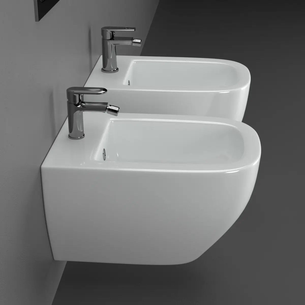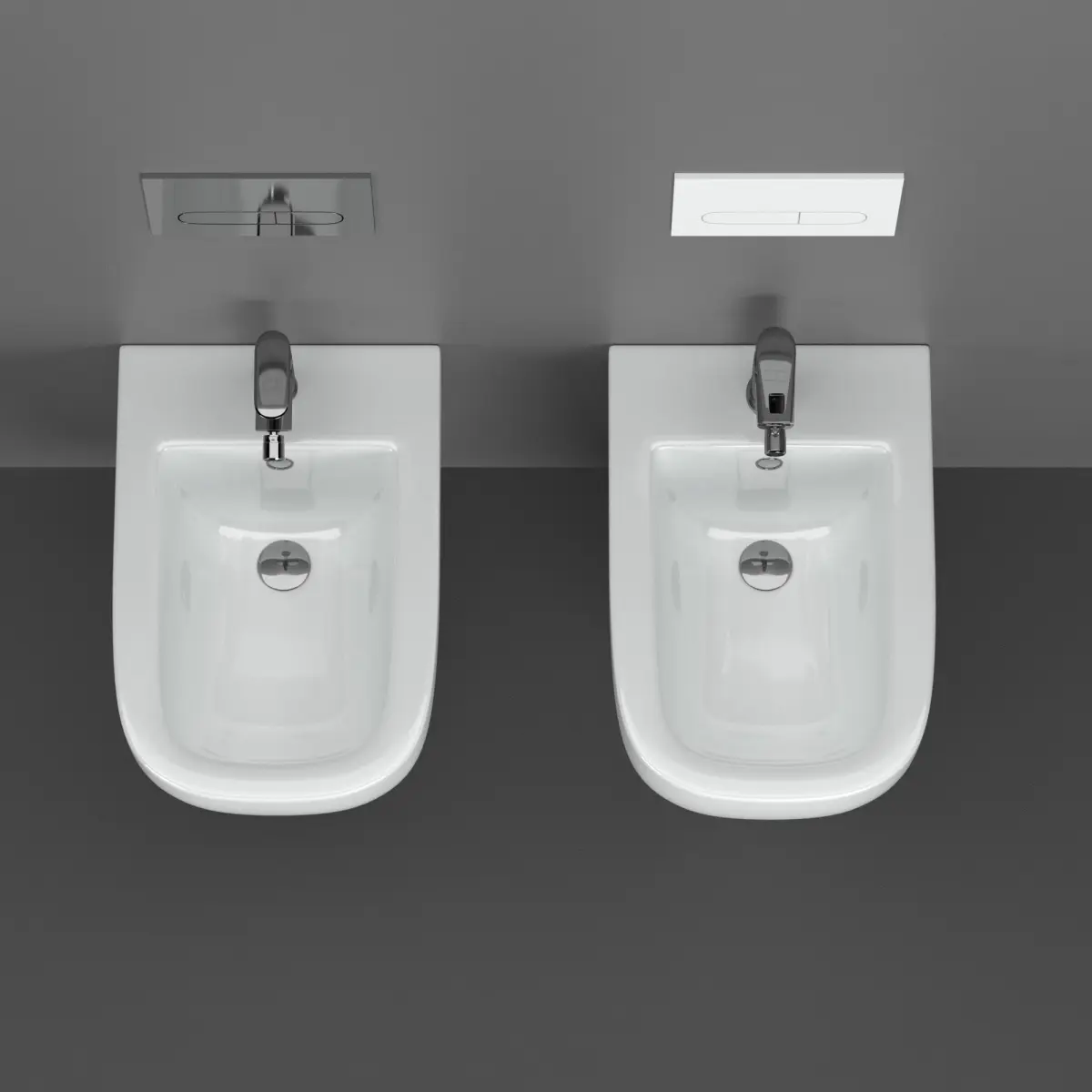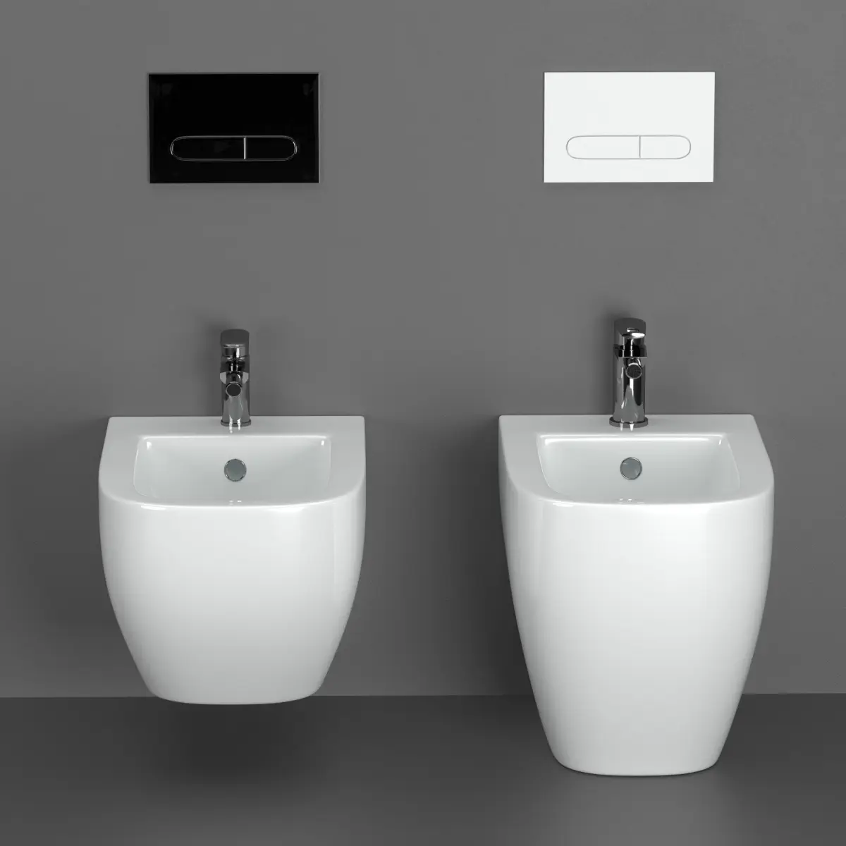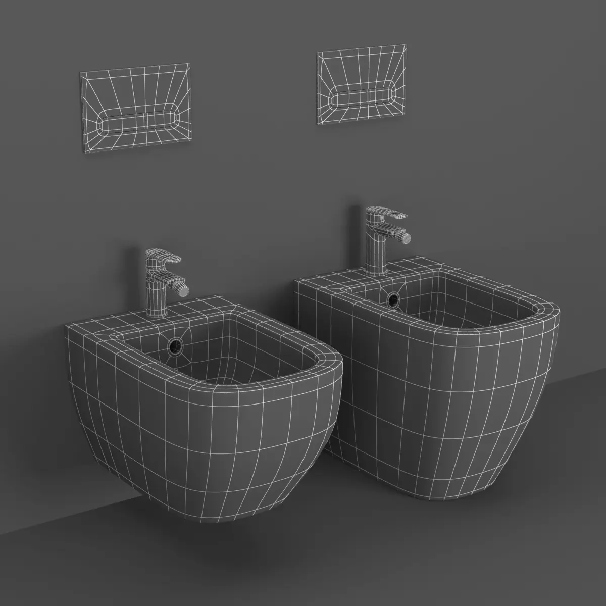 In the scene there are 6 objects of a hanging and floor bidet, 2 mixers for a bidet, and 2 buttons (chrome, and white).