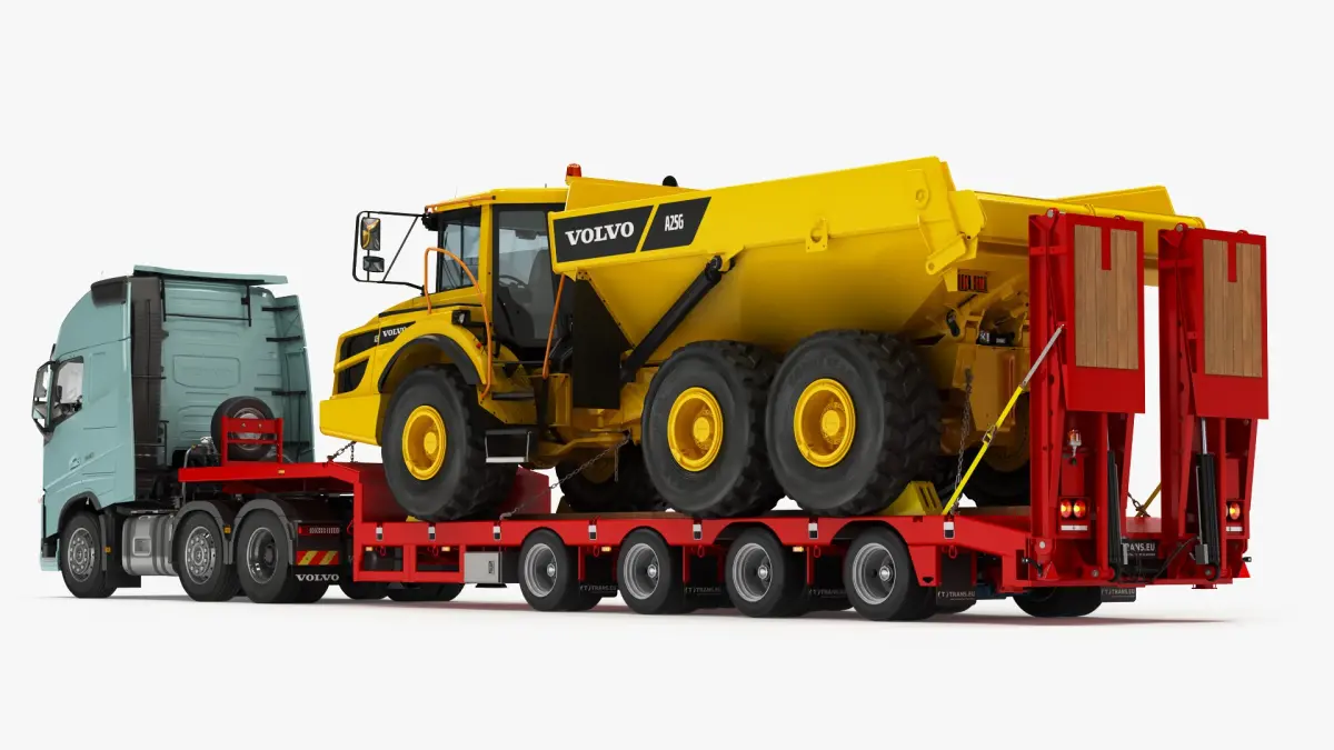 High Detailed and realistic 3d models of Volvo FH and Articulated Truck VOLVO A25G on Lowboy Trailer.