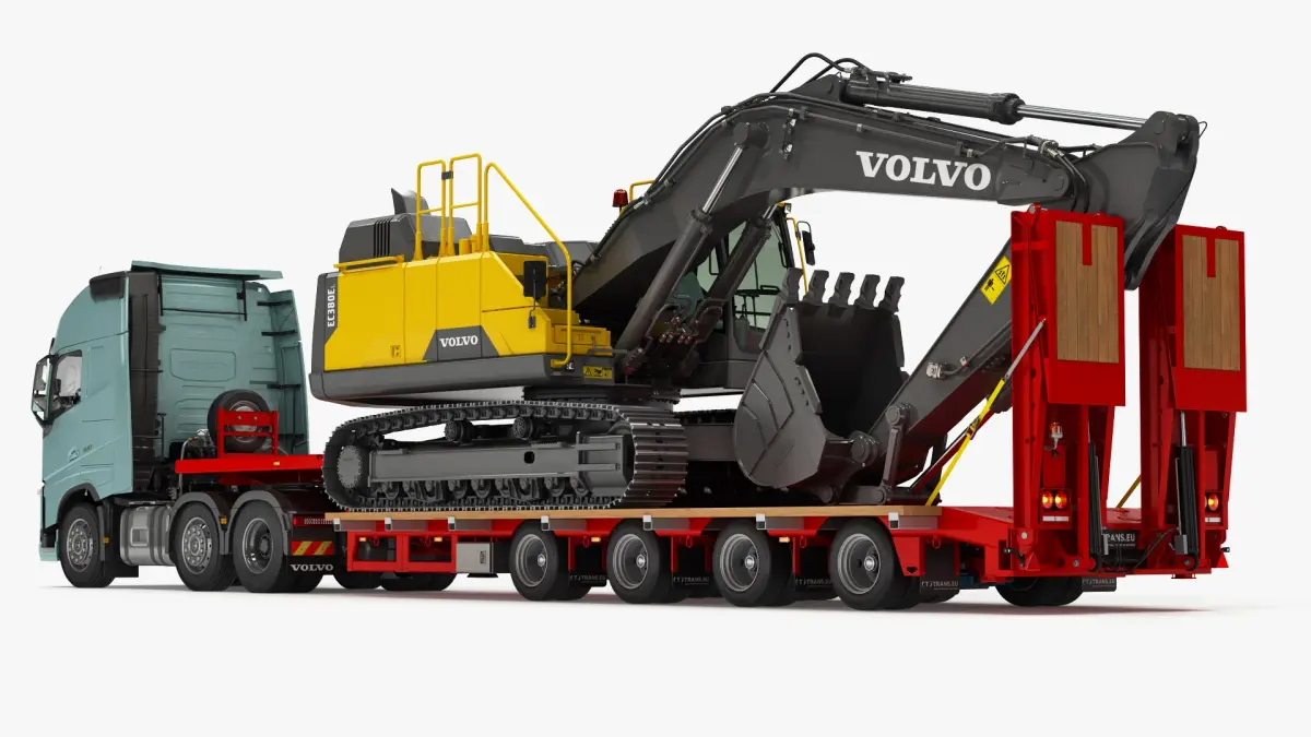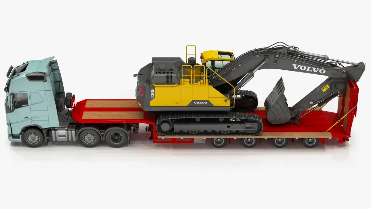 High Detailed and realistic 3d models of Volvo FH and Tracked Excavator VOLVO EC380El on Lowboy Trailer.