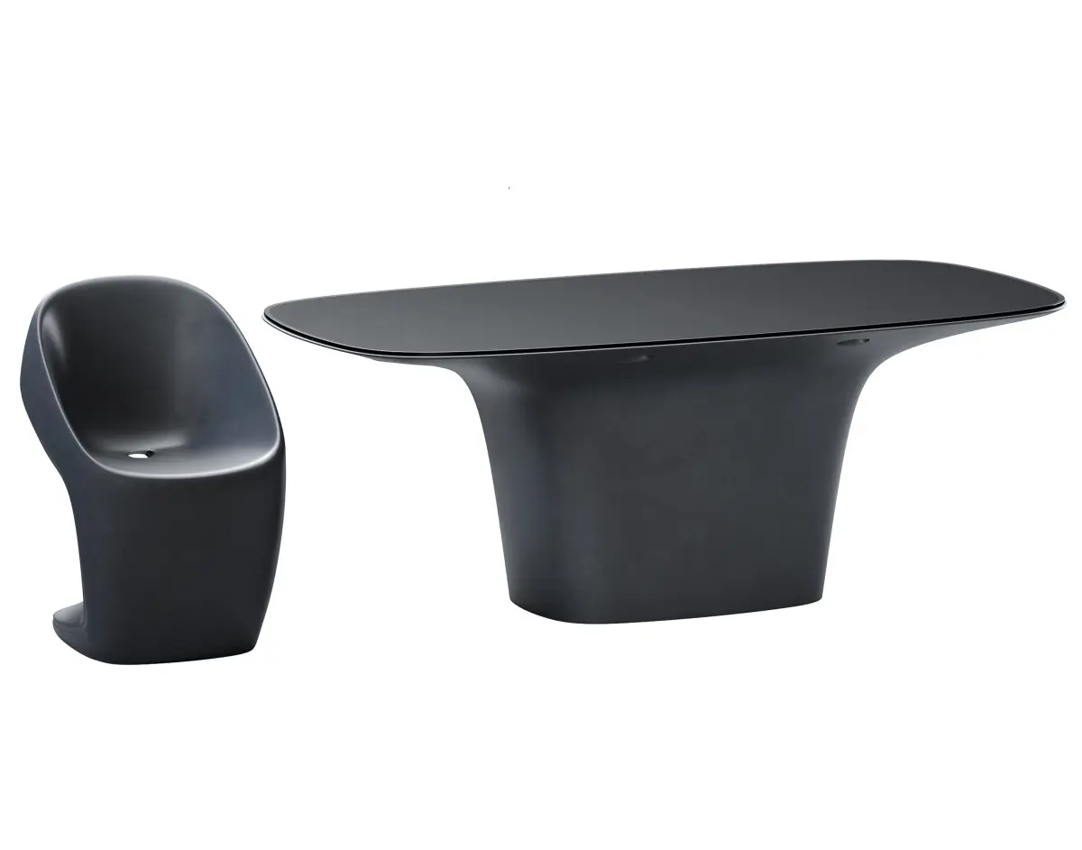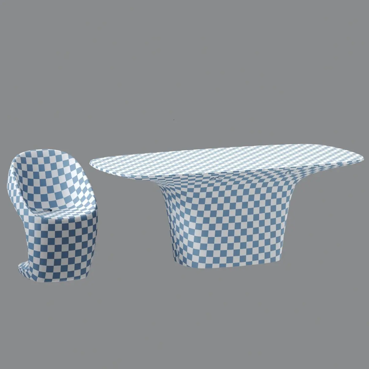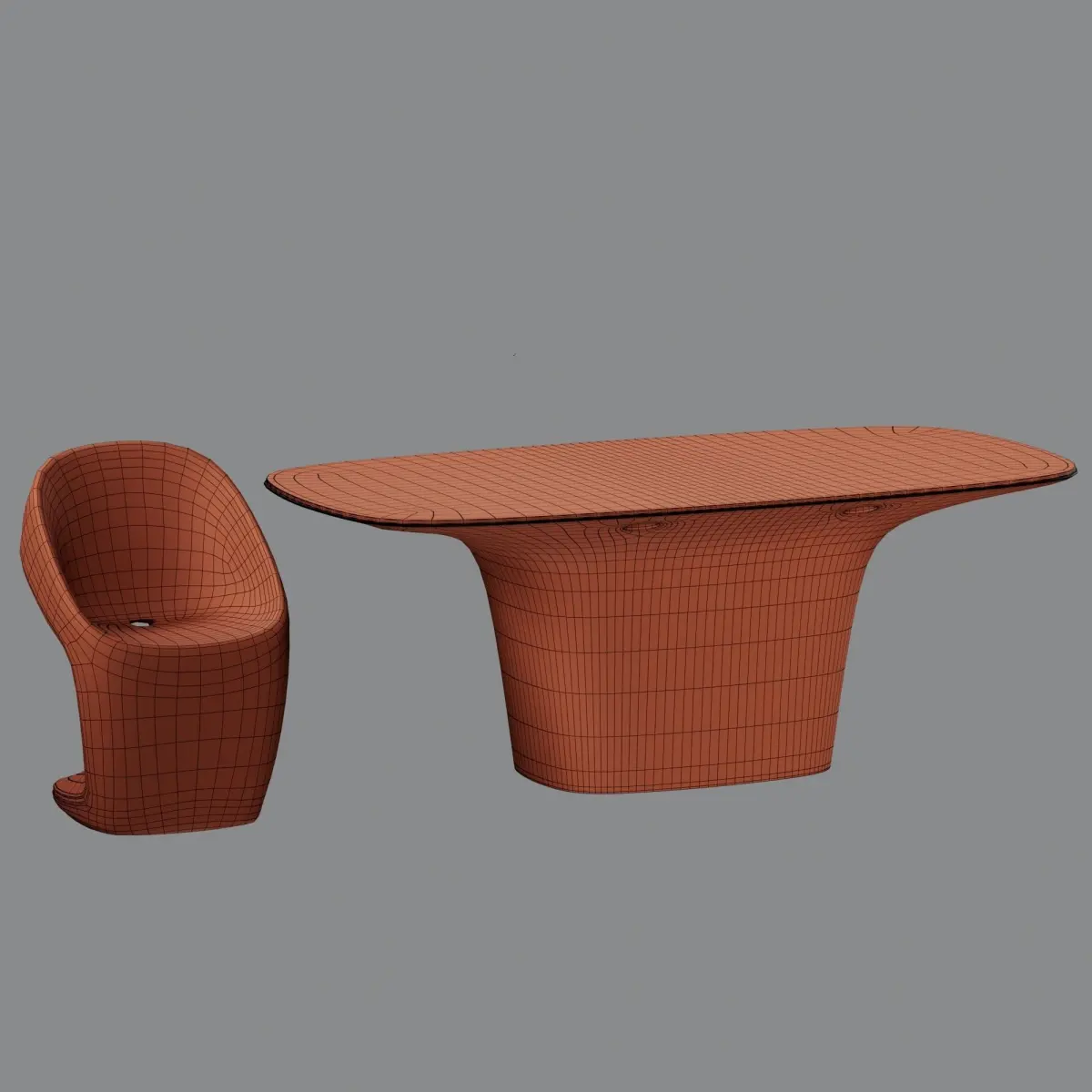 Realistic 3D model of the Ufo Dining table and chairs designed by Ora Ïto and manufactured by Vondom that features opposition of negative and positive shapes giving birth to a Marta Pan inspired monolithic, fluid and sculptural line that encourages comfort and relaxation, and which suits interior and exterior areas.