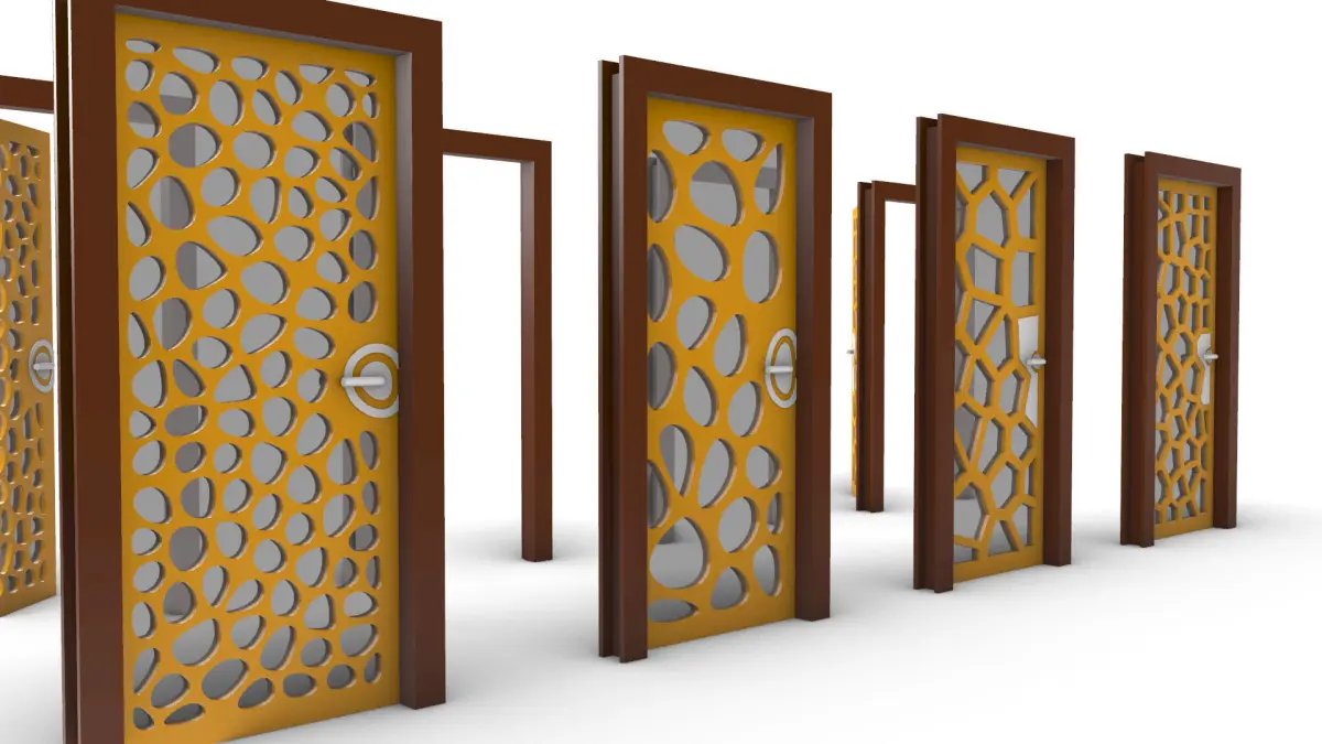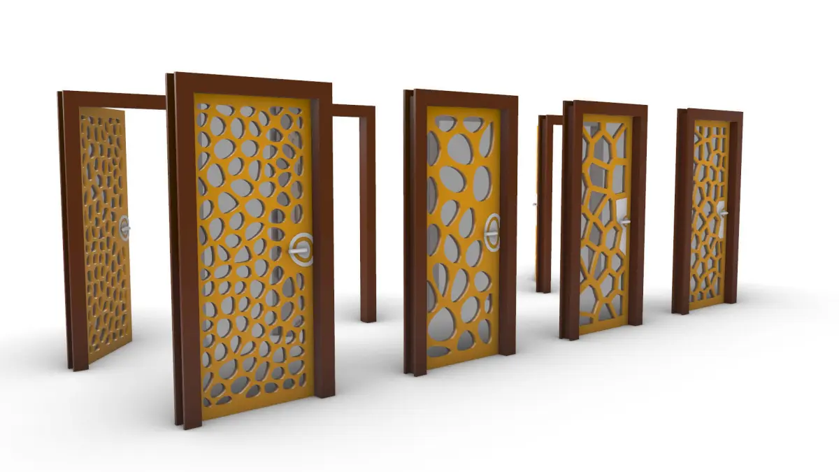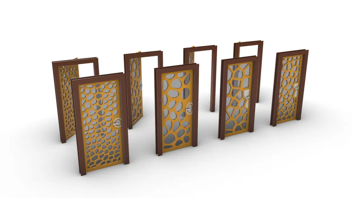 A Collection of 8 Doors with 4 Unique Shapes, each shape exist twice in the files with (45-Degrees) Opened and Closed Door Panels,each door panel has a group of voronoi cell holes filled with glass, each door has a frame, hinges and a door handle,the models could be suitable for different styles and tastes of Architectural Indoor and Outdoor Spaces.