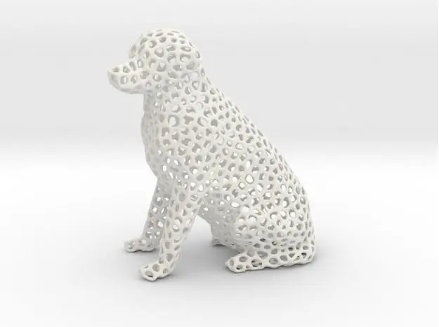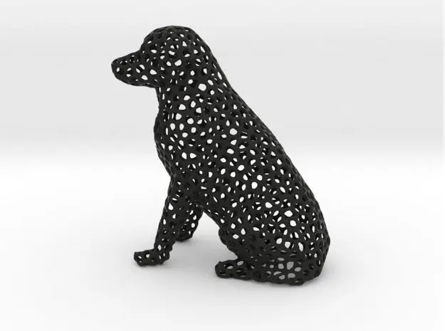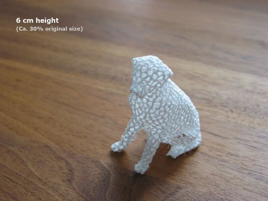 Photos: PLA. 6 cm height. (Ca. 30% original size from Labrador_voronoi_2.stl). I recommend to print the dog larger than 30%. The wall is in this size only 1-2 layers thin.