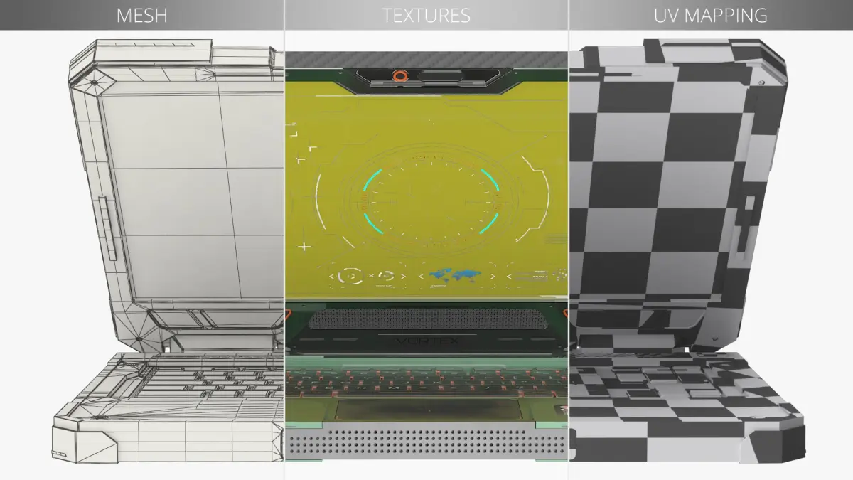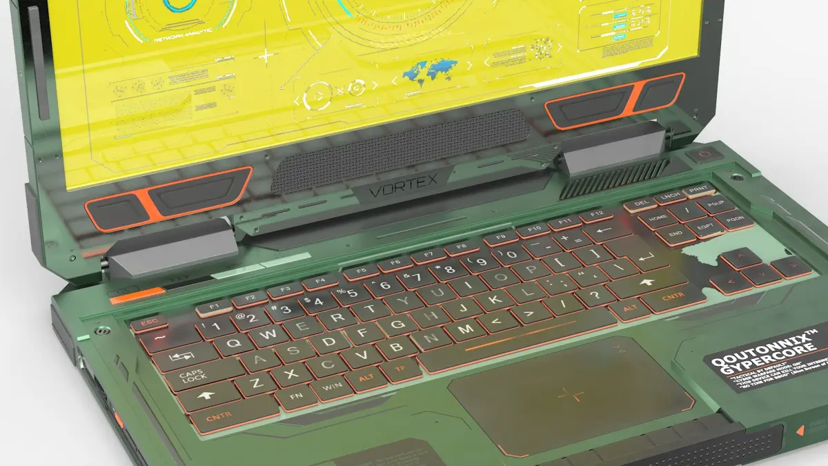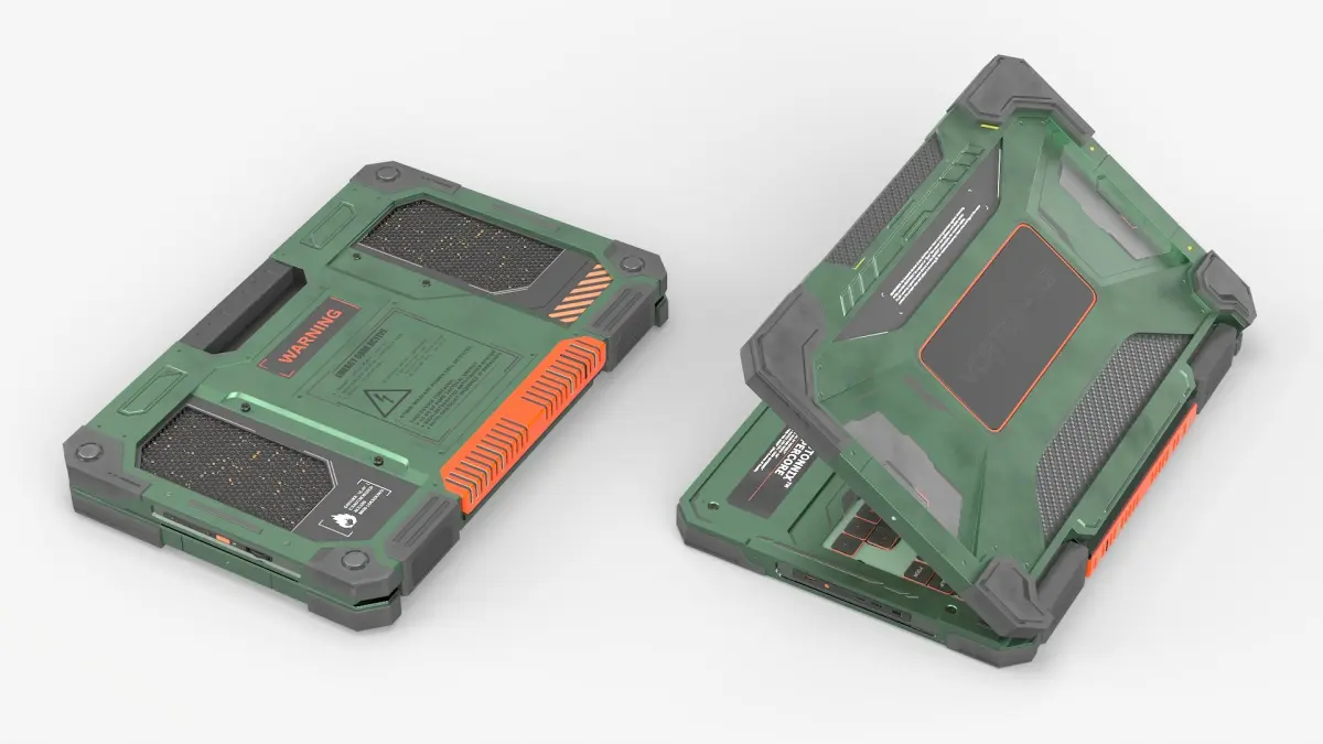 Vortex X9 Sci-Fi Tactical Laptop Opened Green is a 3d model of a futuristic and rugged laptop, featuring innovative design elements and advanced technology.