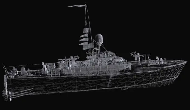 She differs from British built Vosper MTBs in having SO radar, whip ariel and having PT pattern silencers fitted.