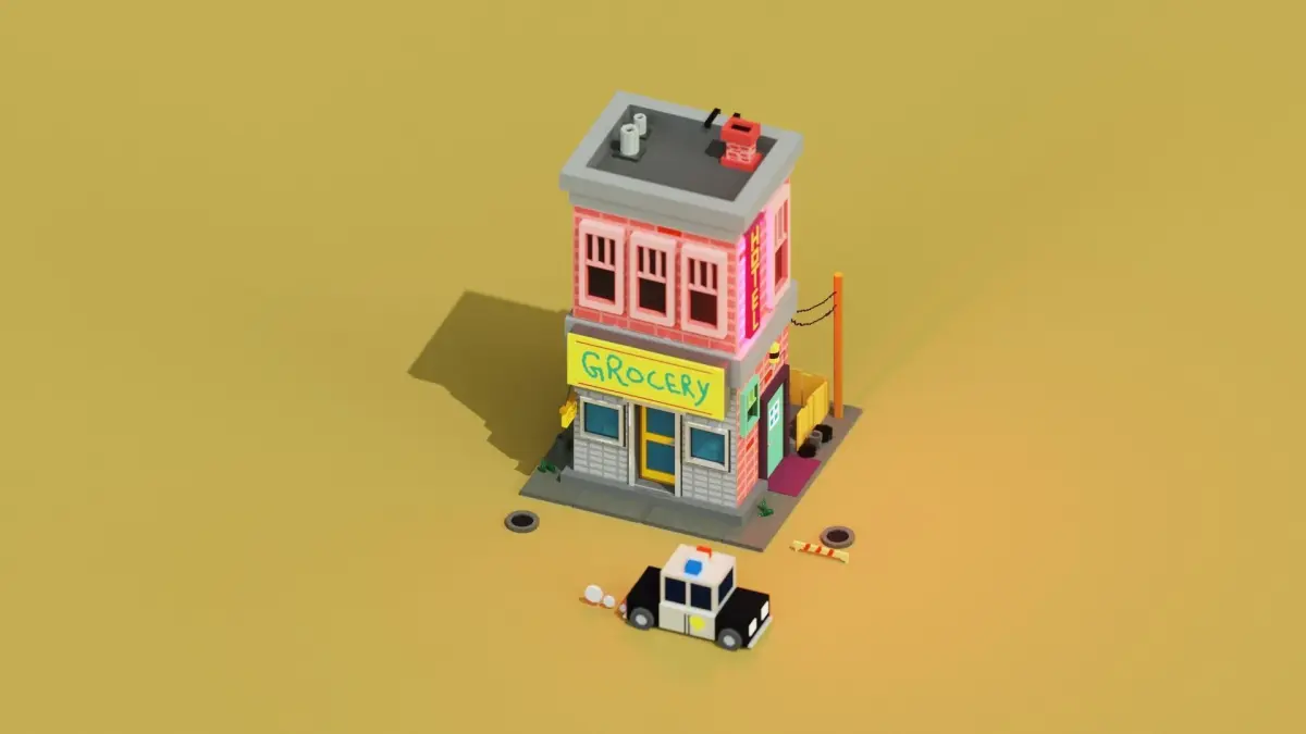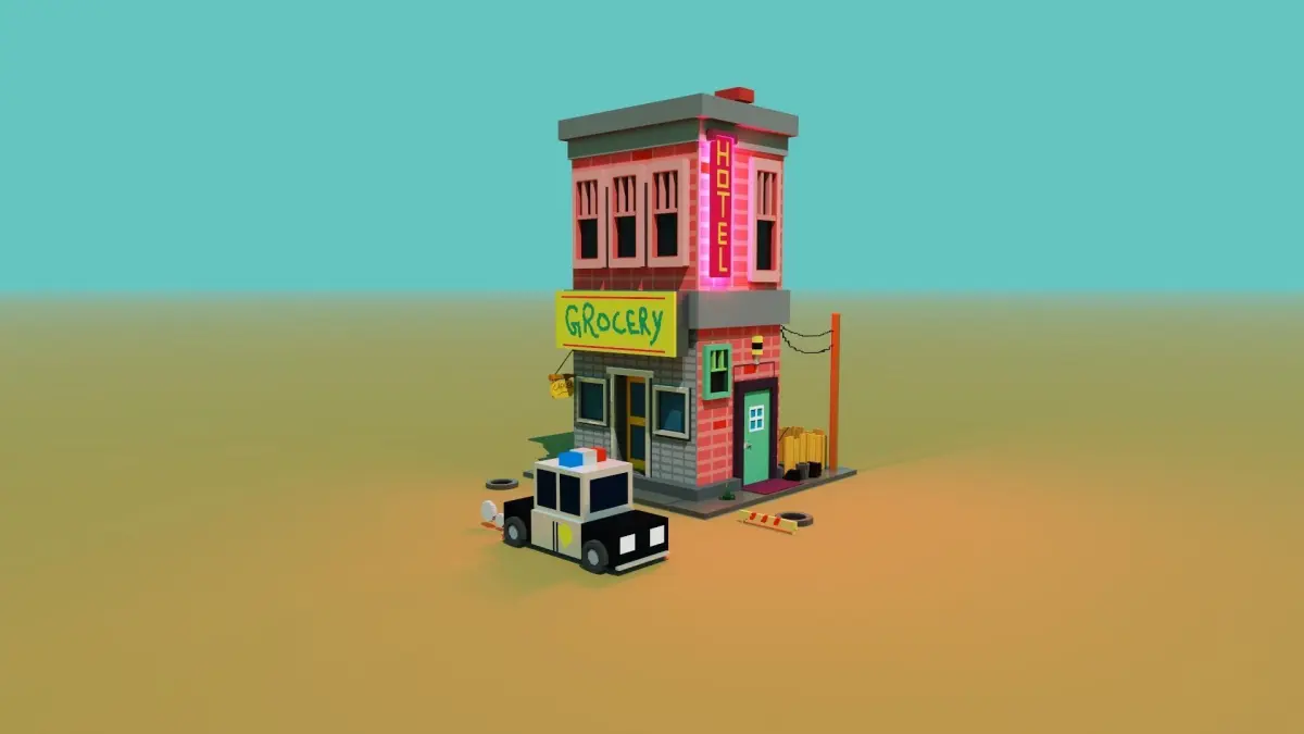 Voxel 3d hotel with grocery store and a police car 3D model