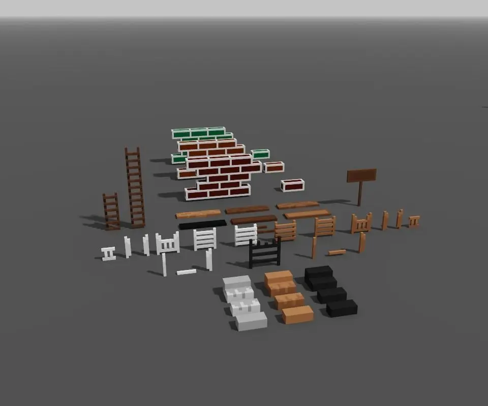 Construction Materials:->Woods->Stair Bars->Stairs->Fences->Fence Gates->Wood Signboard->Briquette Stones->Traffic Lights->Asphalt Roads->Paving Stones->Walls->Door Walls->Window Walls->Roofs->Doors