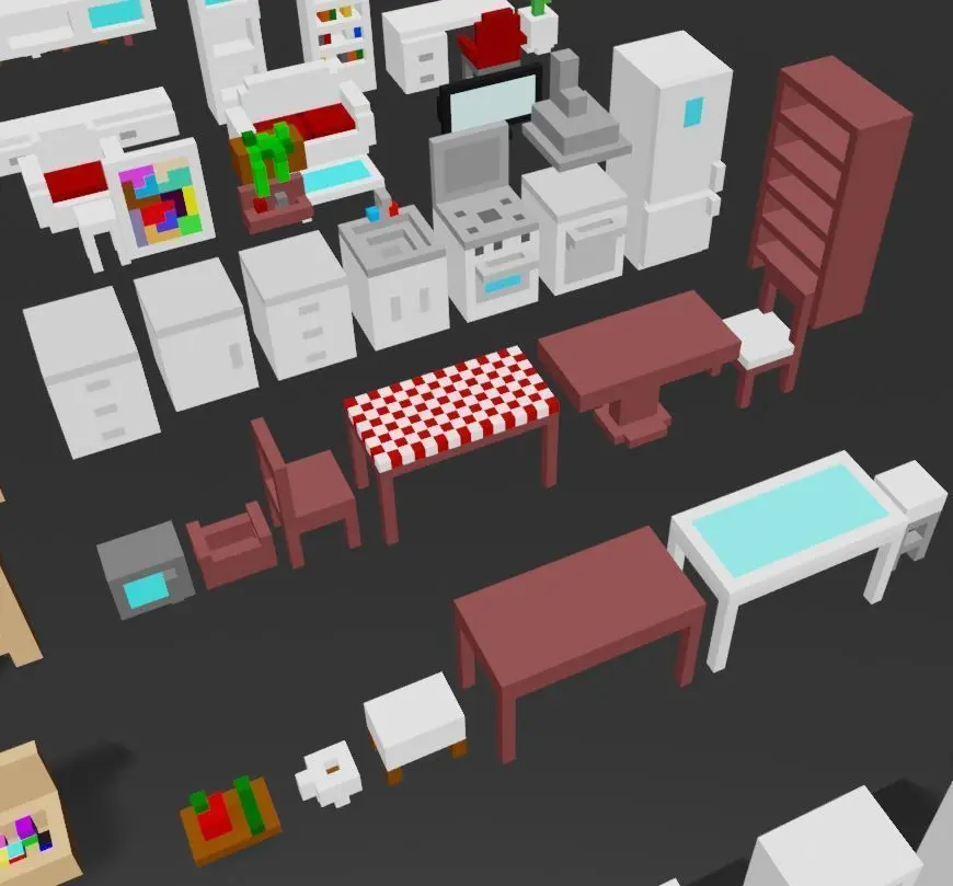 A set of furnitures made through voxel artstyle. This set includes 6 specific home decor themes which are Living room, bathroom, Bedroom, kids bedroom, kitchen and 16 floors tiles.