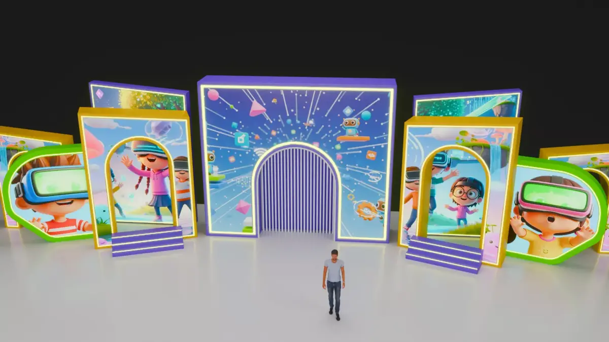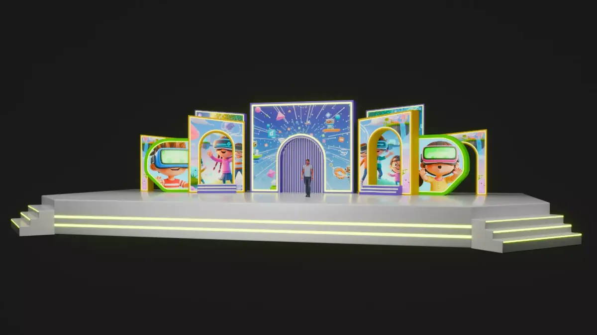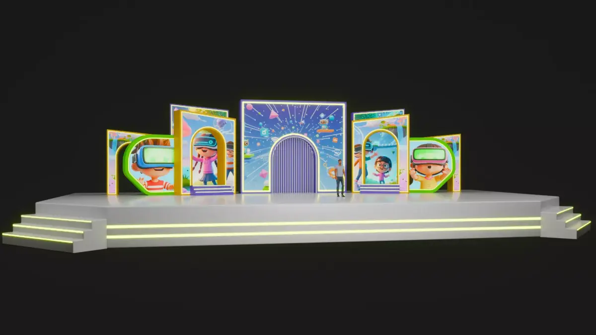 Colorful futuristic VR/tech themed kids event stage set with multi-panel backdrop, arches, and wide platform—perfect for VR events, exhibitions, show stage, metaverse environments, and presentations. Please download the IMG.ZIP files for the background images. (Image texture generated with AI).