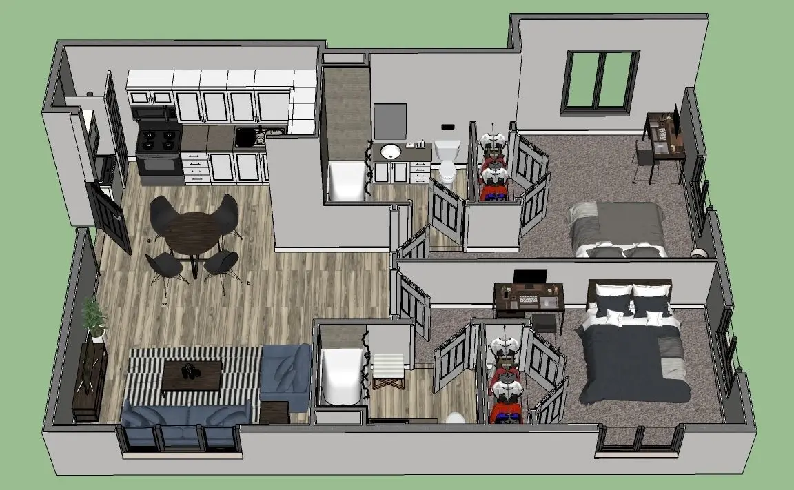 - The model include 2 bathrooms, 2 bedrooms, 1 kitchen and 1 living room with full furnitures.