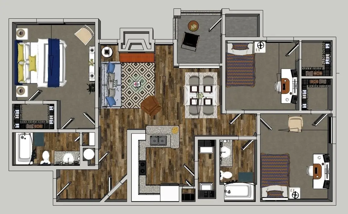 High detailed floor plan model with Vray For Sketchup 5 materials. Its created via Sketchup 2021 but you can find 2017 version seperately for earlier versions of Sketchup. (2017 - 2021) The model include 2 bathrooms, 3 bedrooms, 1 kitchen and 1 living room with full furnitures.FBX file included for converting to other applications. All textures included some of them are PBR (4K-8K textures). All components has been choosen as high poly models which give you the best result on even closer camera angles. You might use the furniture models seperately for your other scenes as much as the textures.