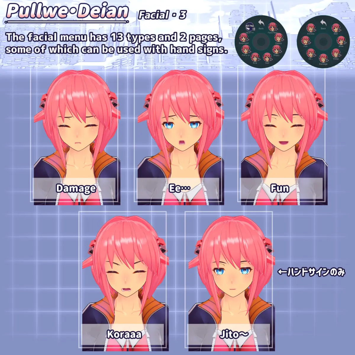 -13 facial expressions available in the facial expression menu