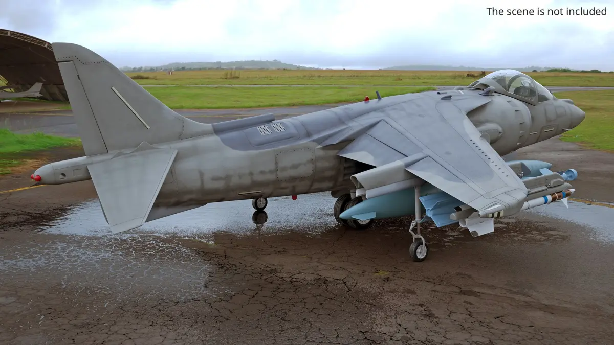 This detailed model showcases the distinctive features of the Harrier jet, including its powerful turbofan engine, vectored thrust nozzles, and wing design. The aircraft is outfitted with weaponry and additional fuel tanks, emphasizing its combat readiness and versatility in various missions.