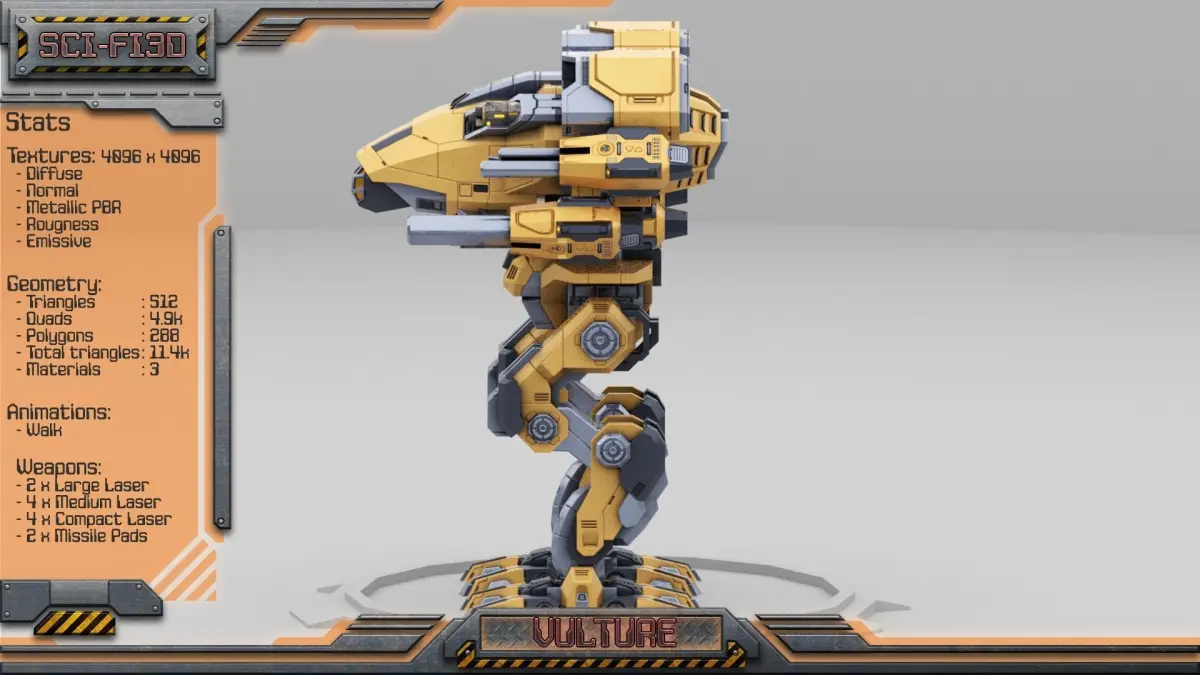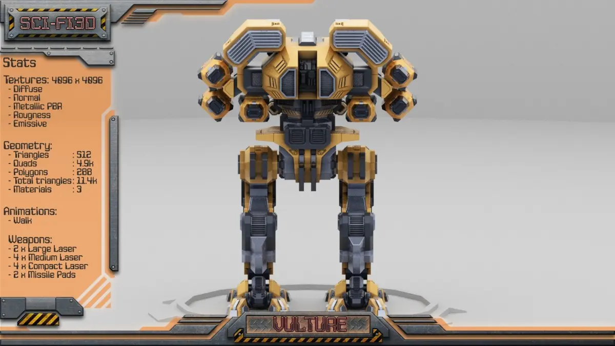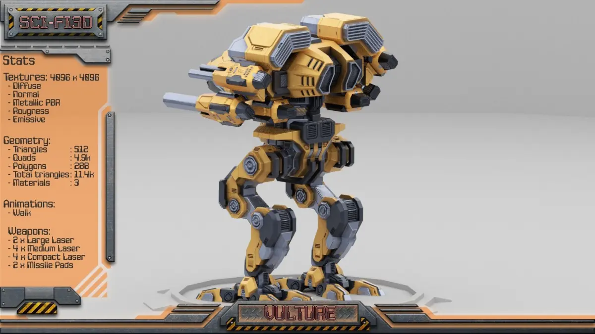 Vulture is one of battle mech project which contains various mechs and individual weapon sets. It is designed as Low-Poly for mobile games.