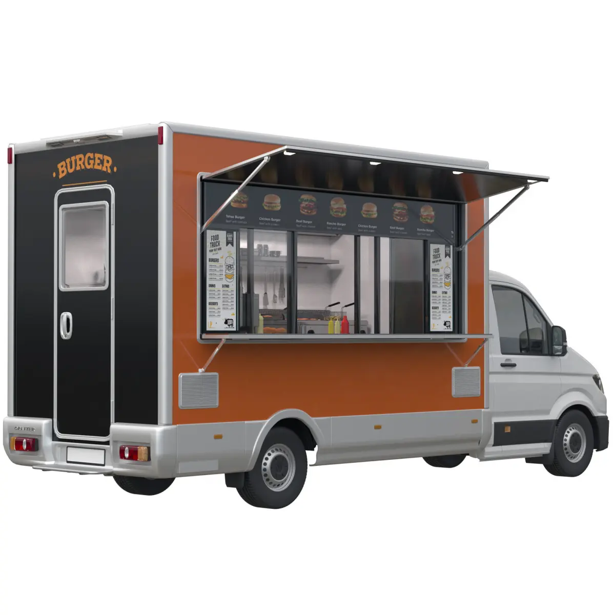 Food Truck VW Crafter 2 with kitchen equipment for cooking burgers, french fries.