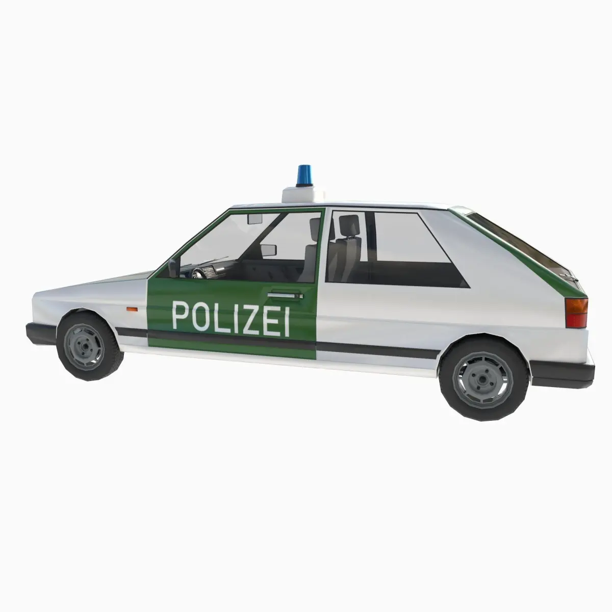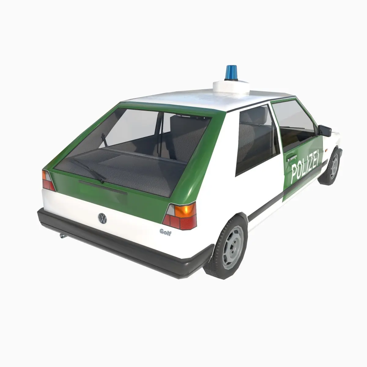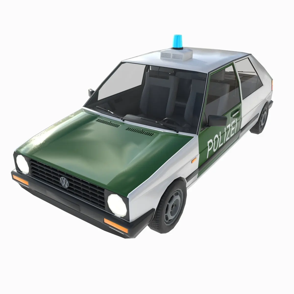 3d model low-poly Volkswagen Golf 2nd generation German Police.The model can be animated. open doors, hood, trunk, turn wheels. The model can easily be used in games and renderings.You can configure the inclusion of headlights, turn signals and brake lights, side lights and flashing lights. An emissive map was made for this purpose.The model was made in Cinema 4D 2023, converted to 3DS Max, blender, Unreal Engine 5.3, Unity 2022.3, fbx, etc.PBR textures 4K 4096x4096 and 2K 2048x2048 targa, jpeg, png formats.