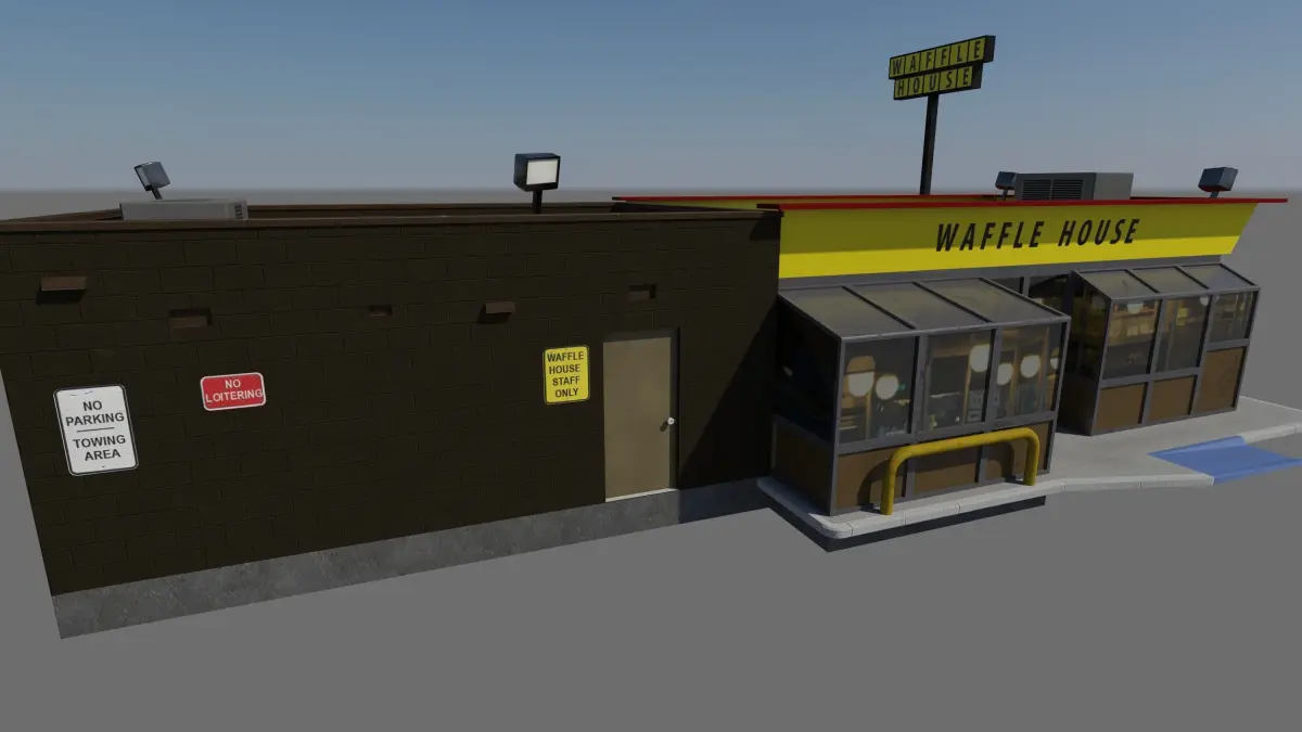 Professionally crafted from a 5-star publisher. Real-world scale Waffle House with realist texturing with single mapping, 4096 x 4096, PBR set up: diffuse, normal, metalness, roughness, AO. Building and sign are on the same texture maps yet separate objects to make it simple to customize your scene. 3dsMax 2014, FBX, OBJ and 3DS - contact me if you need another format.
