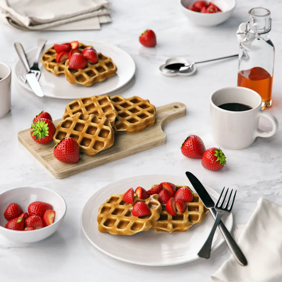 It contains dishes, waffles, strawberries, syrup, cutlery, coffee, pieces of cloth and other models. Background surface is not included.