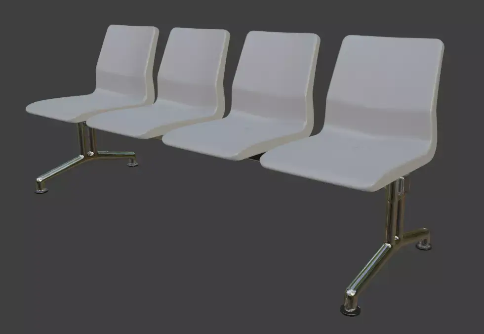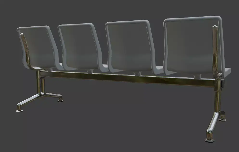 High-quality 3D model of a modern 3-seater airport waiting bench with sleek chrome metal frame and comfortable padded gray upholstery on seats and backrests. This beam-style public seating features sturdy angled legs, armrests, and realistic metallic reflections, ideal for airport terminals, hospital waiting rooms, train stations, office lobbies, clinics, and other public spaces.Perfect for architectural visualization, interior renders, game environments, VR/AR experiences, and urban scenes. The model is optimized with clean topology, UV unwrapped, and PBR materials for high realism while maintaining performance.Key Features: