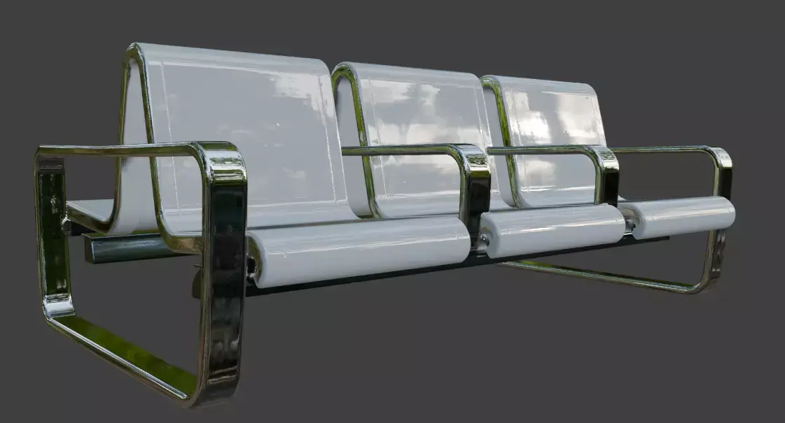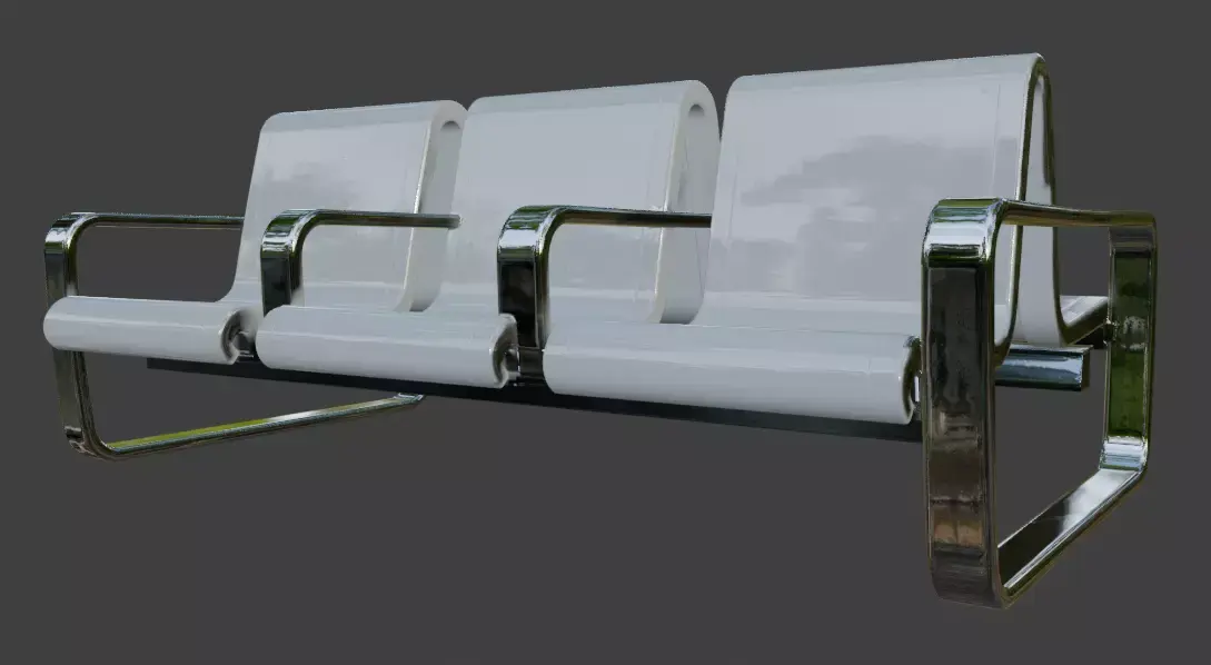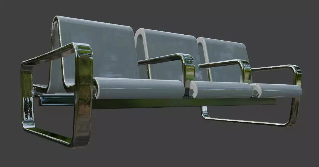High-quality 3D model of a modern 3-seater airport waiting bench with sleek chrome metal frame and comfortable padded gray upholstery on seats and backrests. This beam-style public seating features sturdy angled legs, armrests, and realistic metallic reflections, ideal for airport terminals, hospital waiting rooms, train stations, office lobbies, clinics, and other public spaces.Perfect for architectural visualization, interior renders, game environments, VR/AR experiences, and urban scenes. The model is optimized with clean topology, UV unwrapped, and PBR materials for high realism while maintaining performance.Key Features: