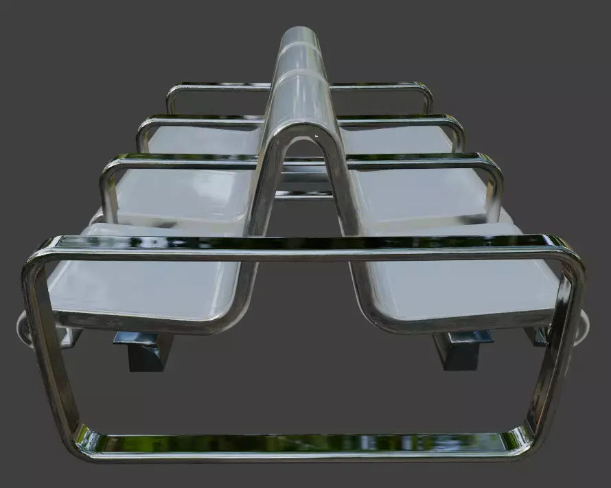 Detailed chrome steel frame with reflective surfacesSoft padded fabric seats and backrestsLow-poly optimized for real-time useSuitable for close-up and mid-range rendersModular design feel for public seating arrangements