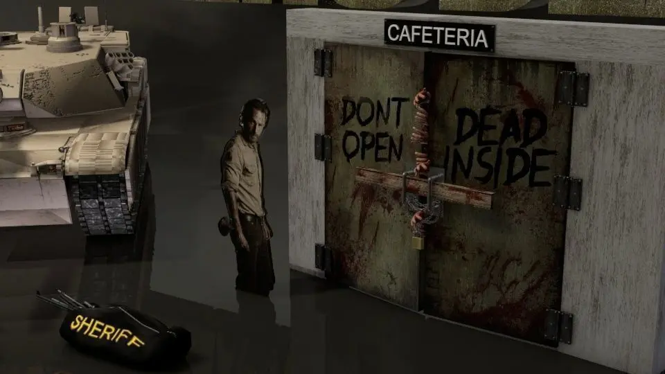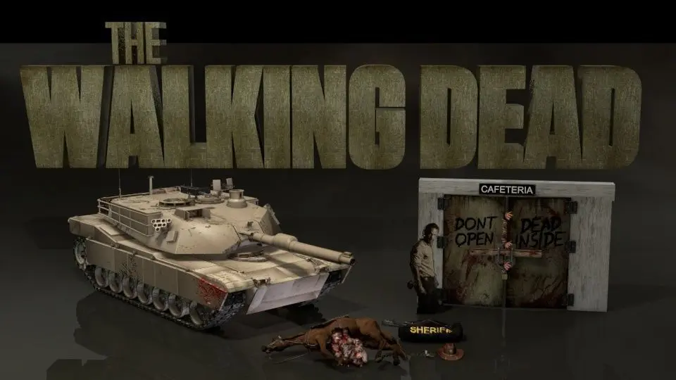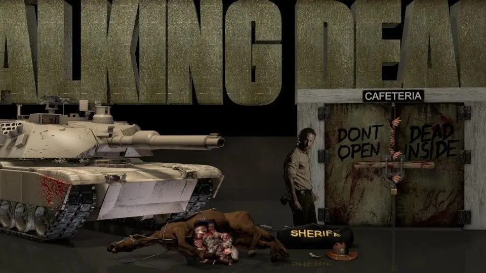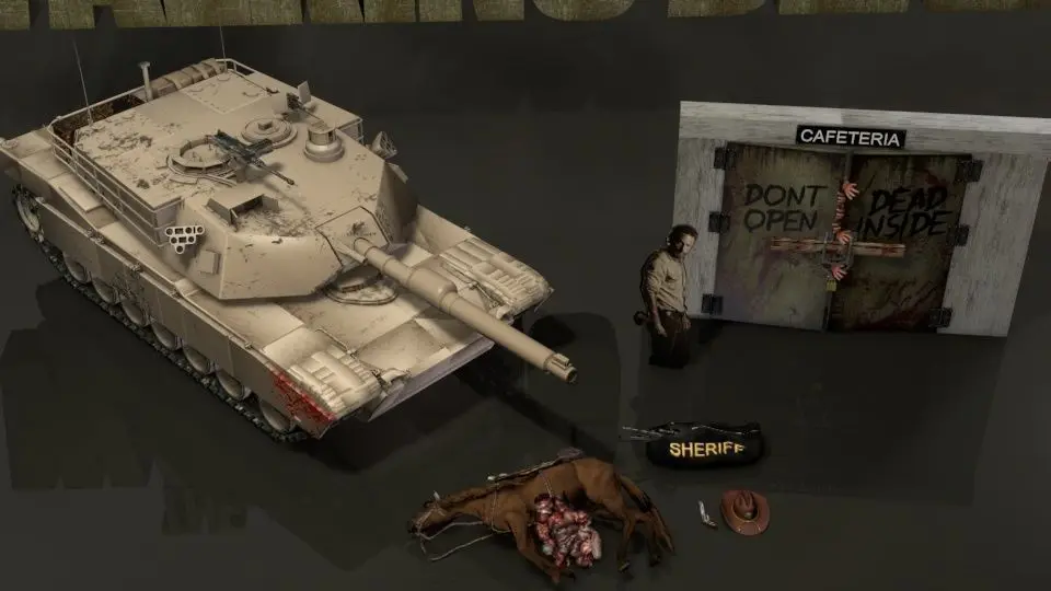 Walking dead Rick Grimes set used in the tribute walking dead domino videoIncludes: don't open dead inside door, gun bag, dead horse, tank, magnum .44 HatPlus the font for the logo (for free)