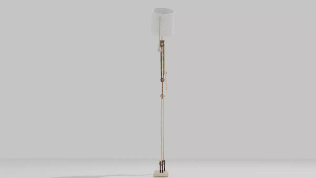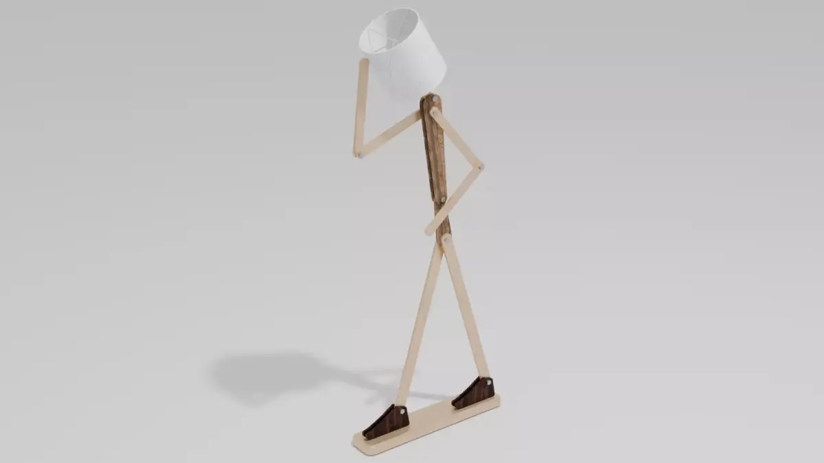 Bring whimsy and modern craftsmanship into your scene with this fully posable human floor lamp. Built like a stylized wooden stick figure, every body part—arms, legs, head, forearms, feet, and torso—is modeled as a separate, movable piece, allowing for expressive posing or custom scene setups. The base, limbs, and head are crafted in light ash wood, the body features warm medium cedar, and the shoes are finished in rich dark walnut for a grounded, artisan contrast. A detailed switch, bale, Edison bulb, and lampshade are included as separate components, giving you full control to remove, swap, or reconfigure them as needed.