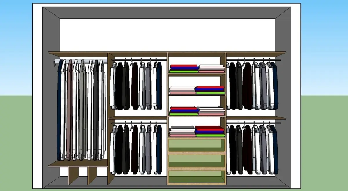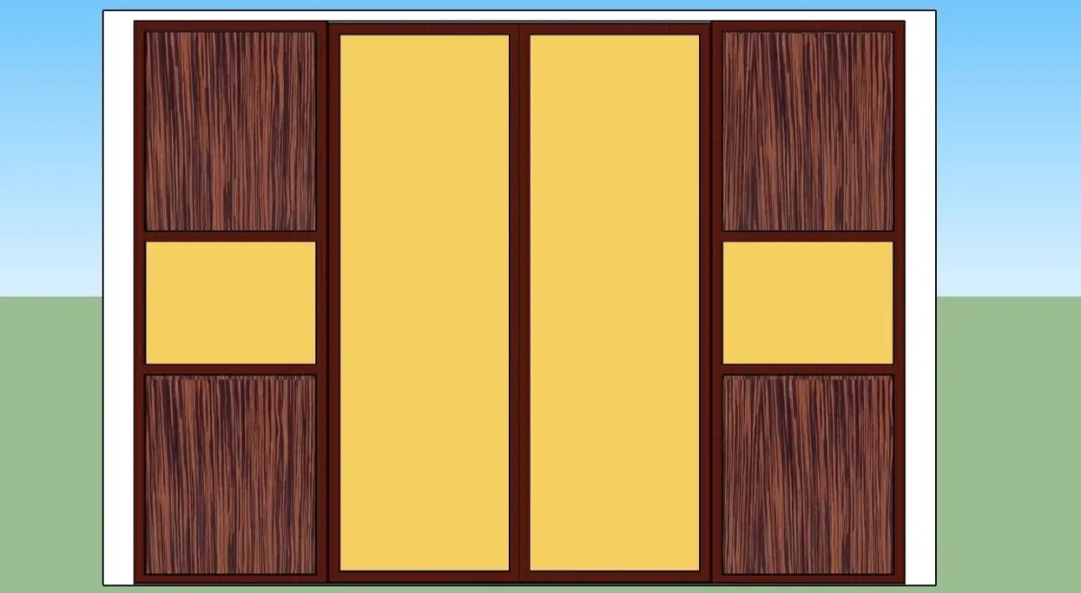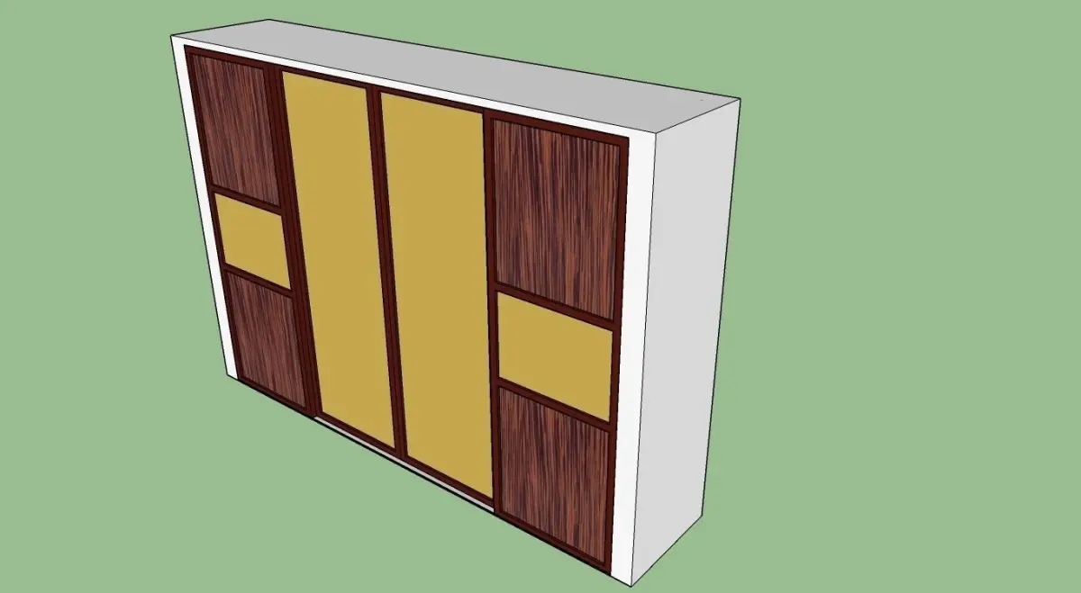 A Wall cabinet of four sections, for long hanging, short hanging, shelves, shoes area and glazed lockers, the exterior is a sliding doors of bronze mirrors and wooden shell, the interior is MDF wood maple color, with accessories, designed and 3D modeled to scale and standards in meter unit, by architect Amr Almasri @ Calligraphy Art Applications