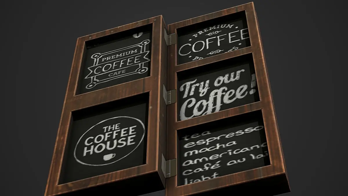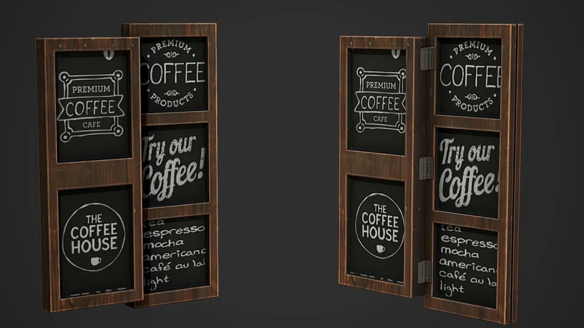 Low Poly Wall Cafe Board model All objects and textures named correctly Texture size 512x512 Diffuse Only. Only one material. Minimum polycount. Great choice for any 1st\3rd person Mobile or PC F2P. Game Fully Rig Ready. All pivots in corrent places.