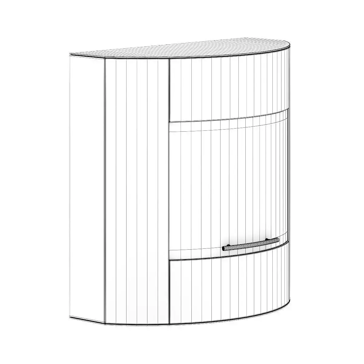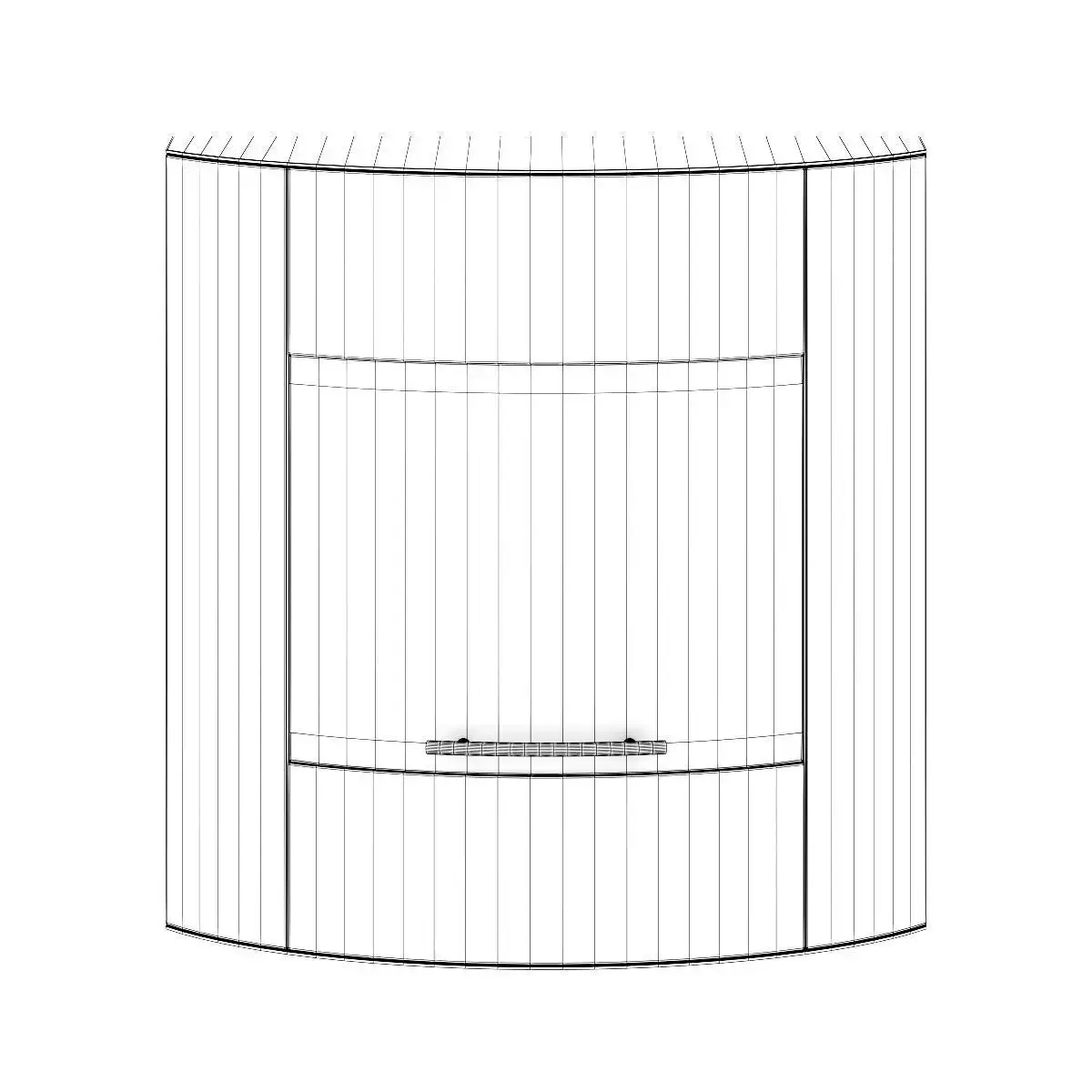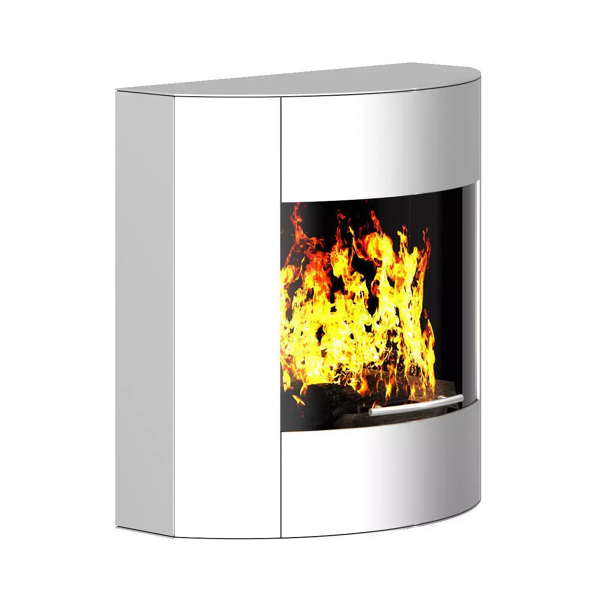 Small wall fireplace. Made of brushed metal with glass door in modern shape. This 3D model contains illuminative fire material.