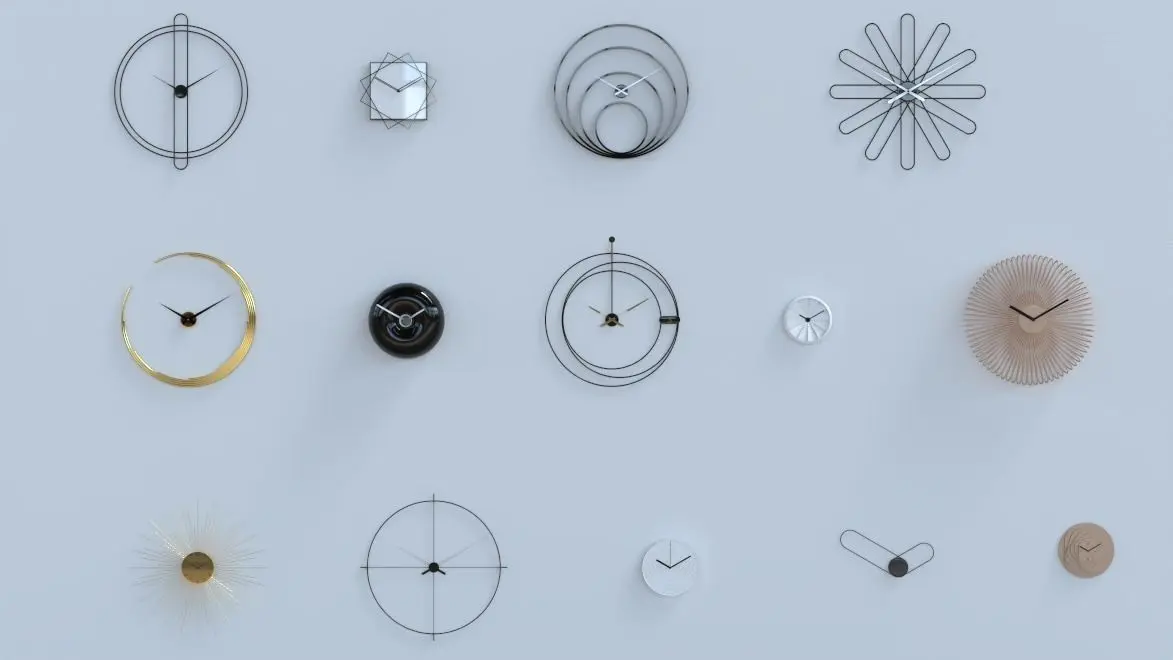 14 peace wall clock, home decoration set. Standard materials. All watches has 2 or 3 materials so you can easily assign your materials in any render engine-plugin.Pivots and centers of movable hands are correct in native format, animation ready.