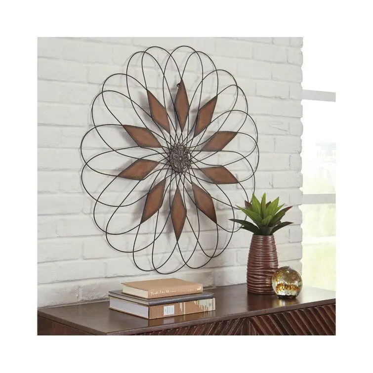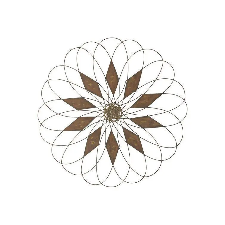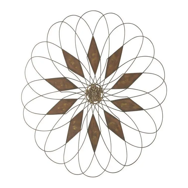 - Add an artful touch– indoors or out– with this eye-catching piece of wall art! Crafted from metal, its curved, petal-inspired design is accented by diamonds with a distressed finish, with a floral medallion placed directly in the centre to complete the look.