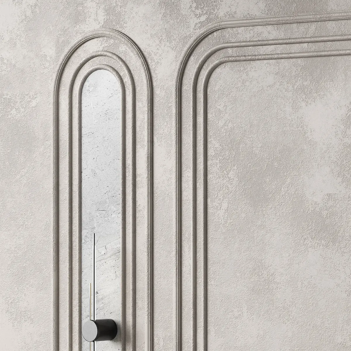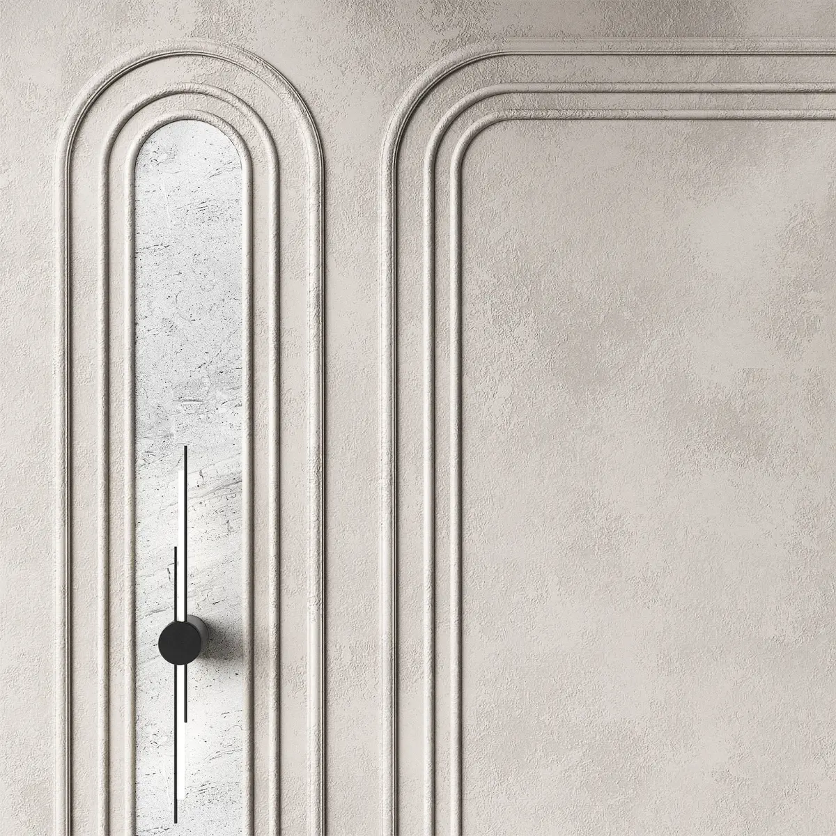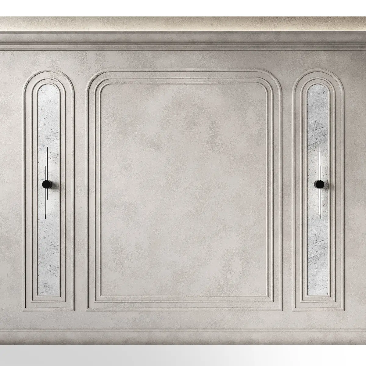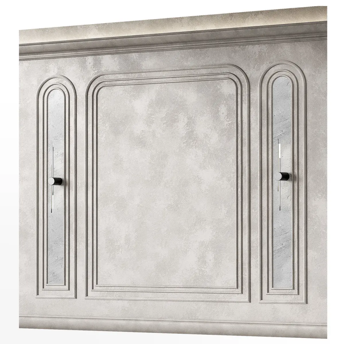 The 3D model contains designer wall panels with arched semicircular moldings.The set includes molding, ceiling cornice with lighting, floor plinth, wall and stucco molding with decorative plaster material, wall sconce.Decorative inserts with marble stone texture.