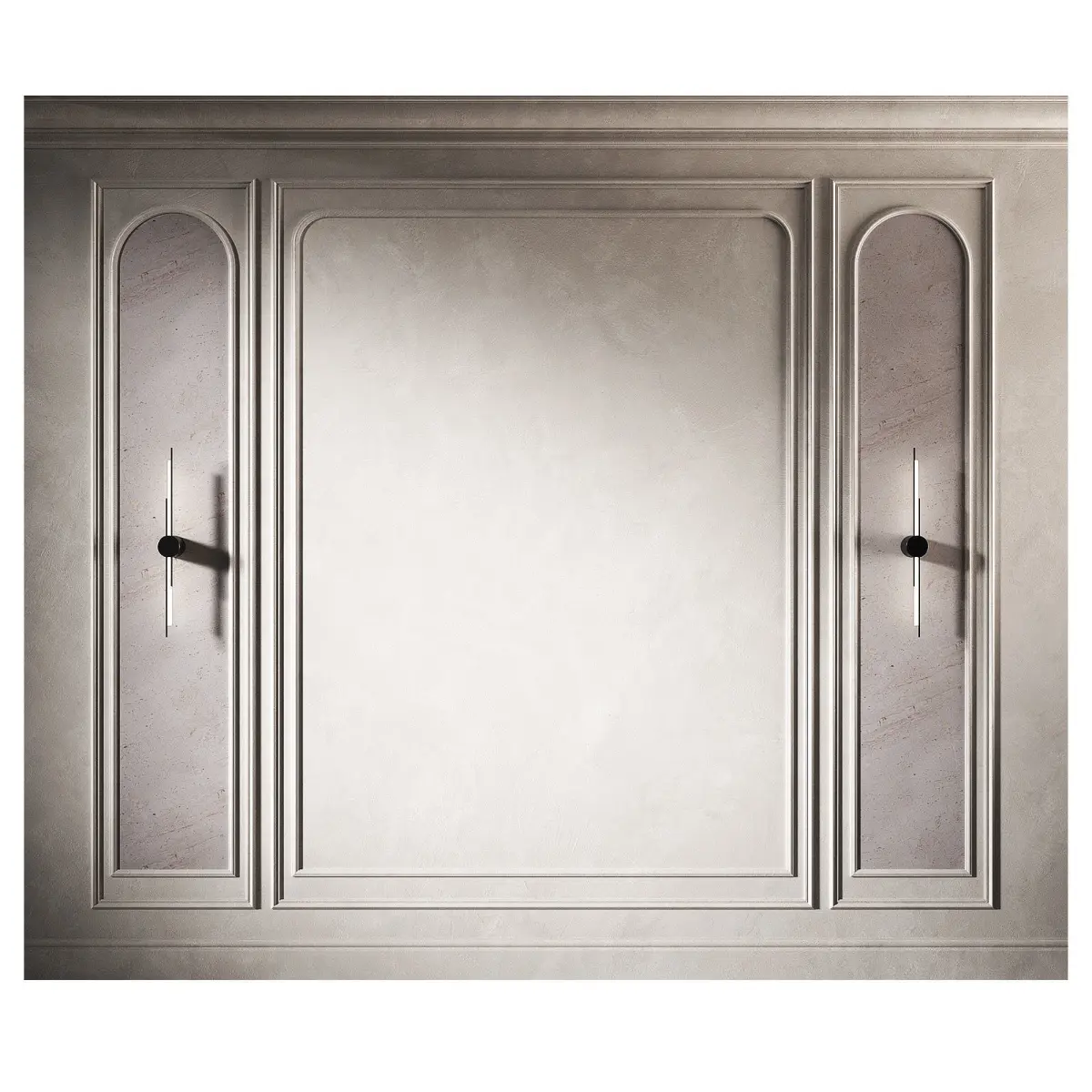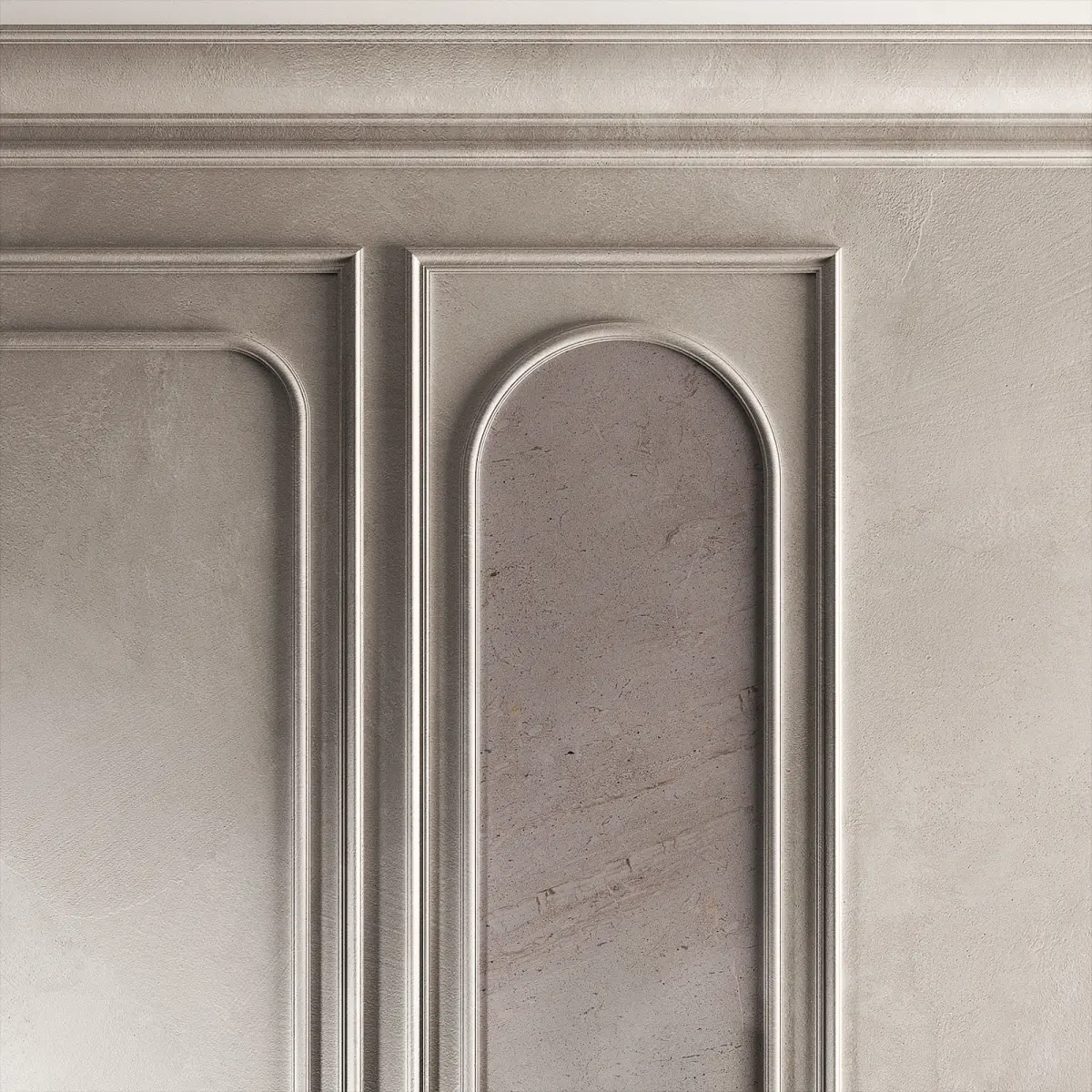 The 3D model contains designer wall panels with arched semicircular moldings.The set includes molding, ceiling cornice, floor plinth, wall and stucco with decorative plaster material, wall sconce.Decorative inserts with marble stone texture.