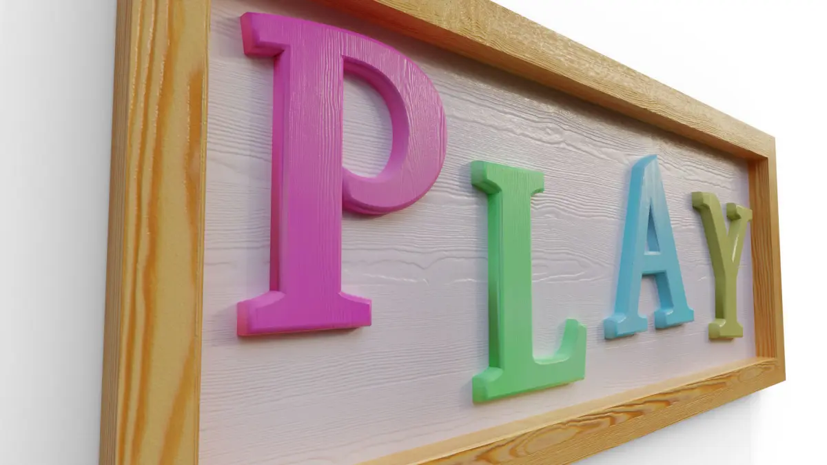 Wall sign suitable for kids room, kindergarten. Model has 2k set of textures (colour, metallic, specular, roughness and normal).