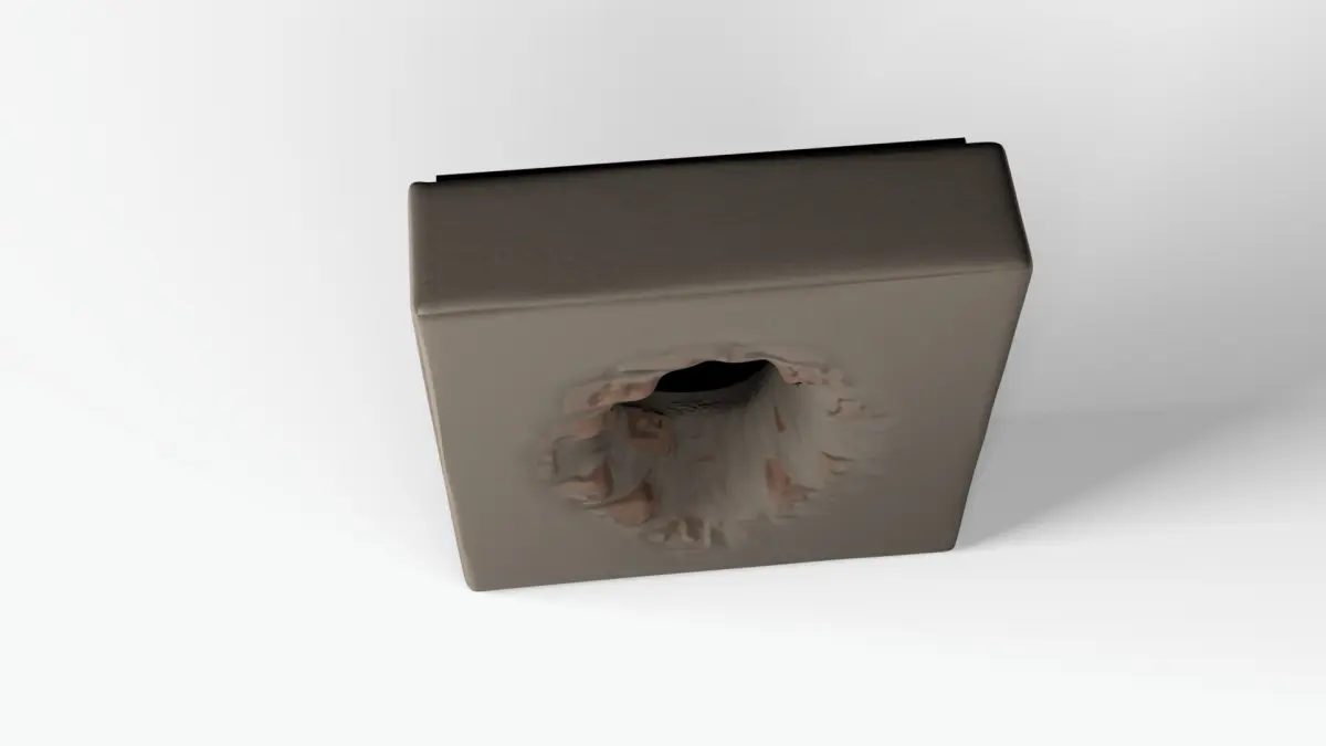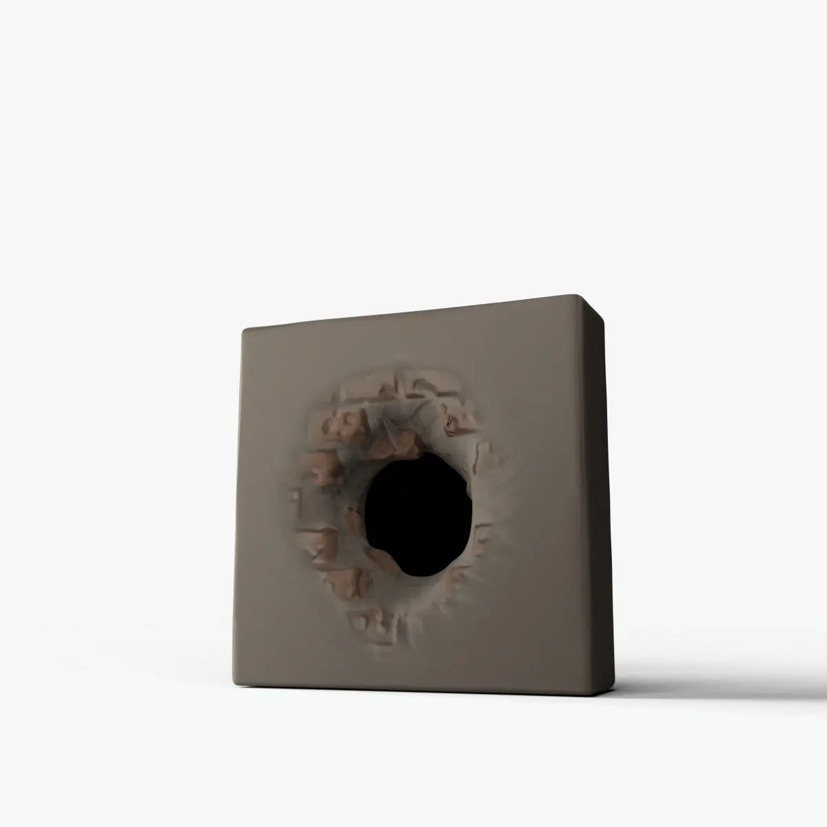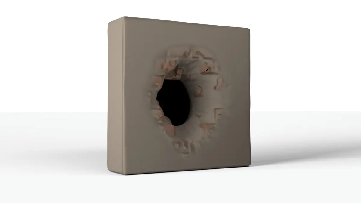 Highly detailed 3D model of a weathered wall with a hole, as if someone dug or broke through it. The model features realistic textures and debris, created with high-quality PBR materials to capture surface roughness, cracks, and rubble details. The wall stands approximately 1 meter (3.28 feet) tall, making it suitable for architectural visualization, game environments, or cinematic scenes depicting destruction or decay.
