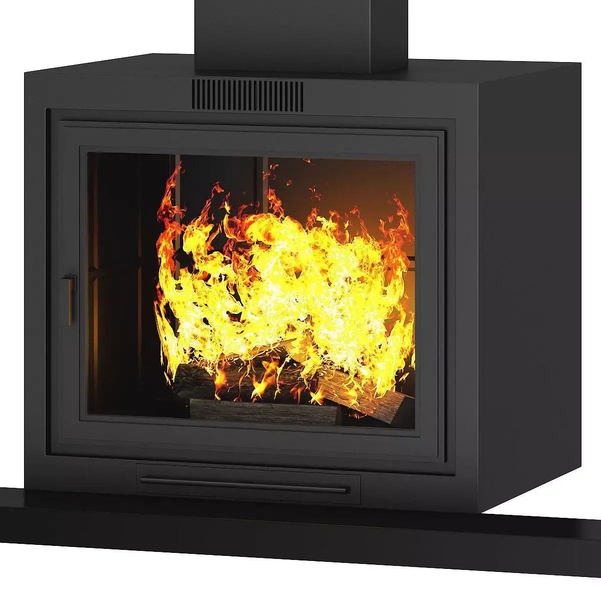 Rectangular wall fireplace with black shelf. This 3D model contains illuminative fire material.