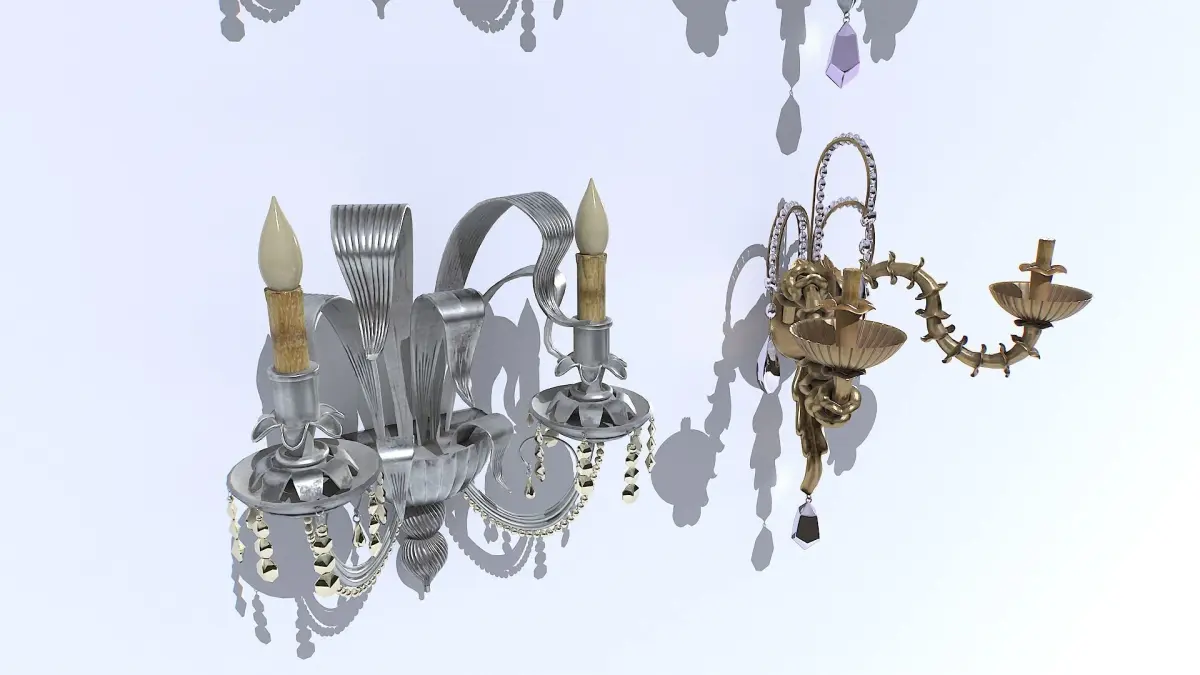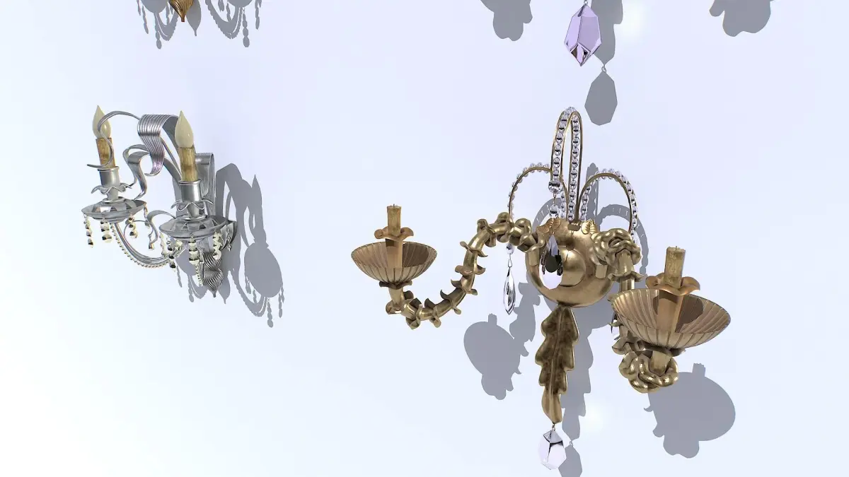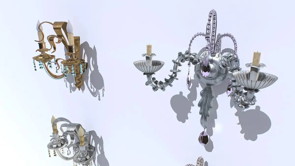 Pack of gold and silver classic wall lights. Real scale but scale as you needs. 1 material each light and 2 sets of textures (gold, silver) for a total of 4 different objects.