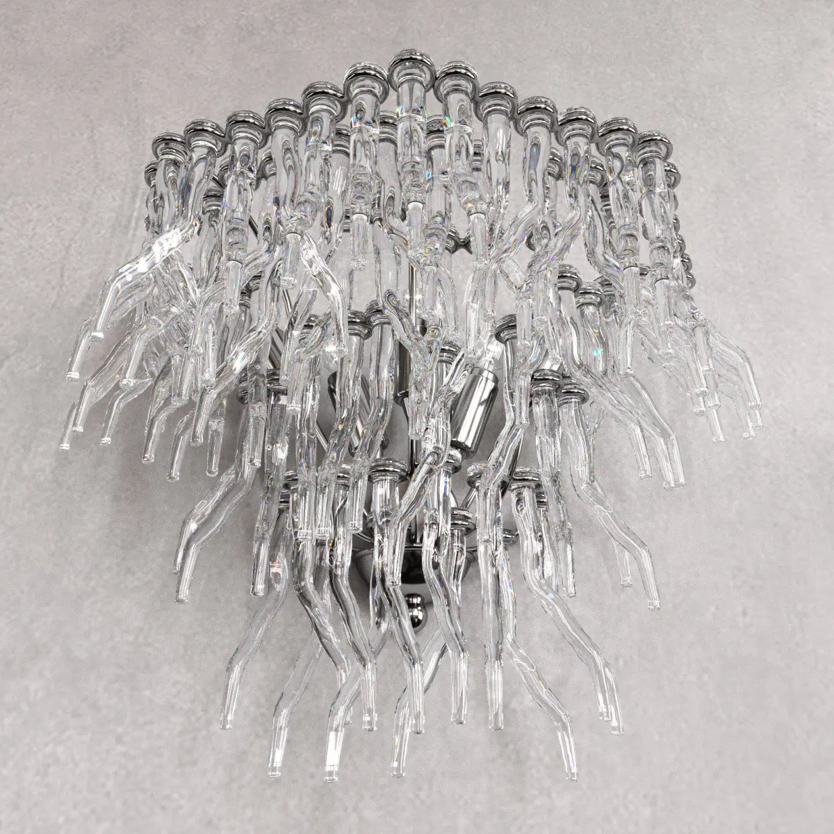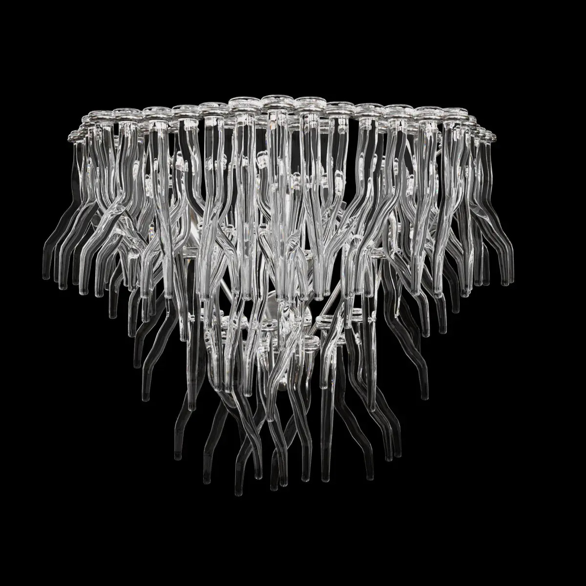 Showcasing a superb silhouette composed of countless, flame-like elements in transparent glass whose design is inspired by the seductive shapes of corals,this chandelier features a metal frame embellished with a satin silver finish. A magnificent addition to the most sophisticated contemporary interiors, this piece is enlivened with mesmerizing glares produced by the light projected by the 5 ES bulbs (each G9 and 33W) hidden behind the glass components.