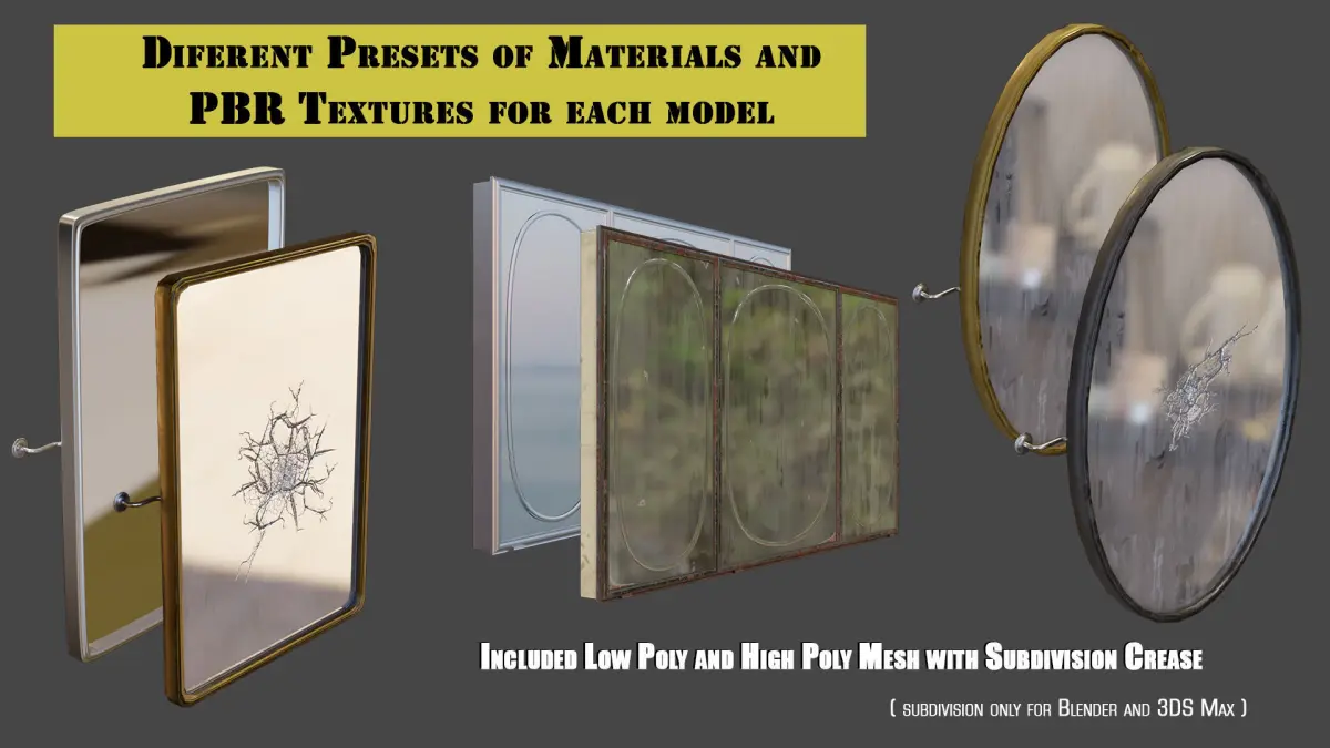 - Comes with 3 Mirrors, low poly and high Poly meshes, 2 presets of PBR Textures and 1 material in the doc files for each model