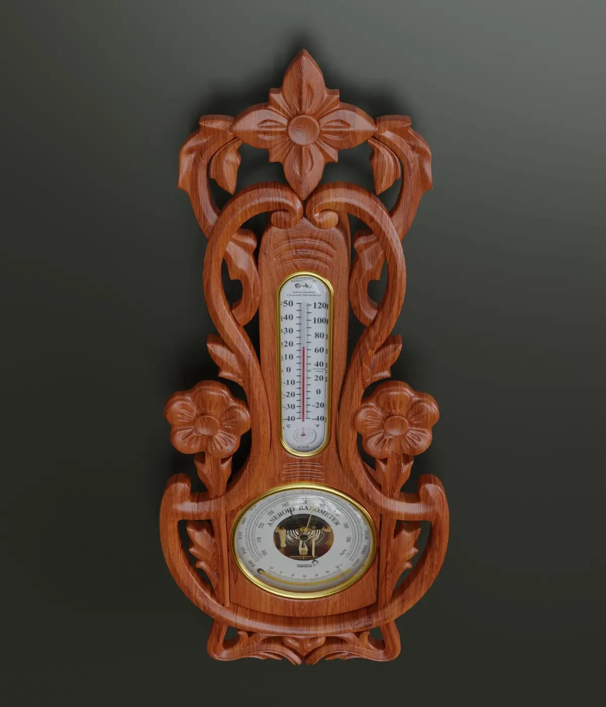 Wall mounted wooden thermometer with barometer. All model objects are combined into one mesh. Wood textures, thermometer and barometer scales are packed in a zip archive.